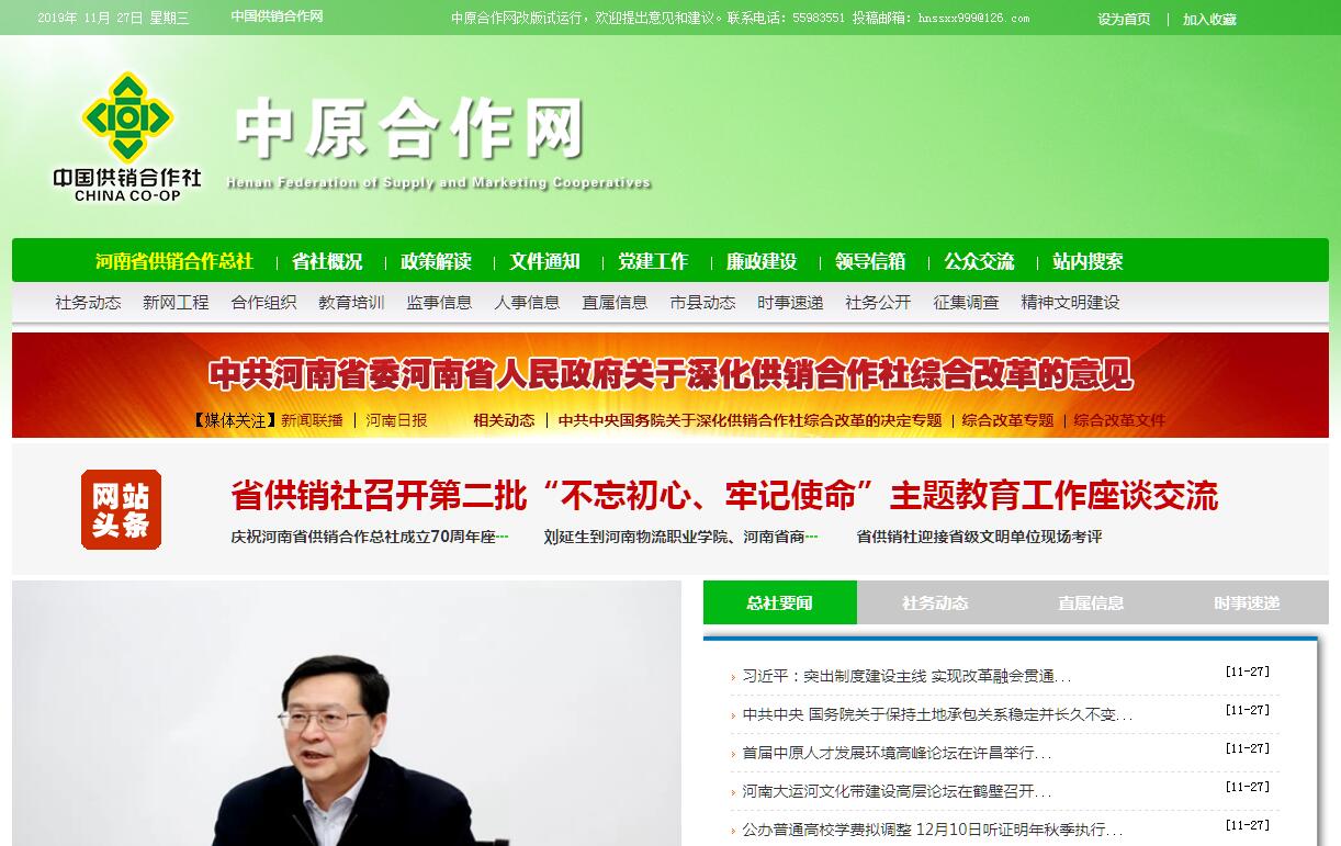 河南省供销合作总社成立于1949年,是省政府直属事业单位。全省现有省辖市供销社18个,县级供销社132个,乡镇基层社1878个,社有企业1089家,各类系统培训机构18个,经营服务网点6.5万个,干部职工36.33万人。其中,省社直属事业单位7个,直属企业23个。2018年,全系统完成销售总额5477亿元,实现利润31亿元,资产总额479亿元,所有者权益达到145亿元。截止2018年底,全系统土地托管(流转)822万亩,建设农产品市场163家,农村综合服务社5.9万个;领办创办专业合作社7293个,专业合作社联合社187个,发展各类协会1685个,在发展现代农业、促进农民致富、繁荣城乡经济中发挥着重要作用。河南省机构编制委员会(豫编办〔2012〕299号)文件将河南省供销合作总社的职责明确如下:(一)贯彻落实党中央、国务院和省委、省政府有关农村经济和社会发展的方针、政策;参与研究和实施全省合作经济发展和农村现代流通的政策和规定。(二)负责制定全省供销合作社发展战略和发展规划,指导全省供销合作社的改革与发展。组织全省供销合作社系统资产、资金、资本、资源的整合优化和管理。(三)负责发展农村合作经济组织的指导、协调、监督、服务、教育培训职能,落实国家扶持农村合作经济组织的政策和措施。(四)负责重要农业生产资料、农副产品、再生资源和烟花爆竹经营管理,建设新农村现代流通网络,搞活农村商品流通。(五)负责全省供销合作社系统推进农村合作经济组织体系、农村社会化服务体系和农村现代流通体系建设,活跃城乡商品流通,促进城乡经济社会统筹发展。(六)受政府委托,负责开展农村职业技术教育和农民技能培训,提升农民和农村专业技术人才素质。(七)行使社有资产出资人代表职能,依法享有资产收益、重大决策和选择管理者的权利。负责社有资产保值增值和资产安全及指导全系统加强社有资产的监督管理。(八)负责向政府和有关部门及时反映农村合作经济组织和供销合作社的意见和建议,依法维护全省供销合作社系统和农村合作经济组织的合法权益。(九)负责指导全省供销合作社系统的干部队伍建设和人才开发工作,加强对全省供销合作社系统干部职工的教育培训。(十)承办省委、省政府和全国供销合作总社交办的其他工作。