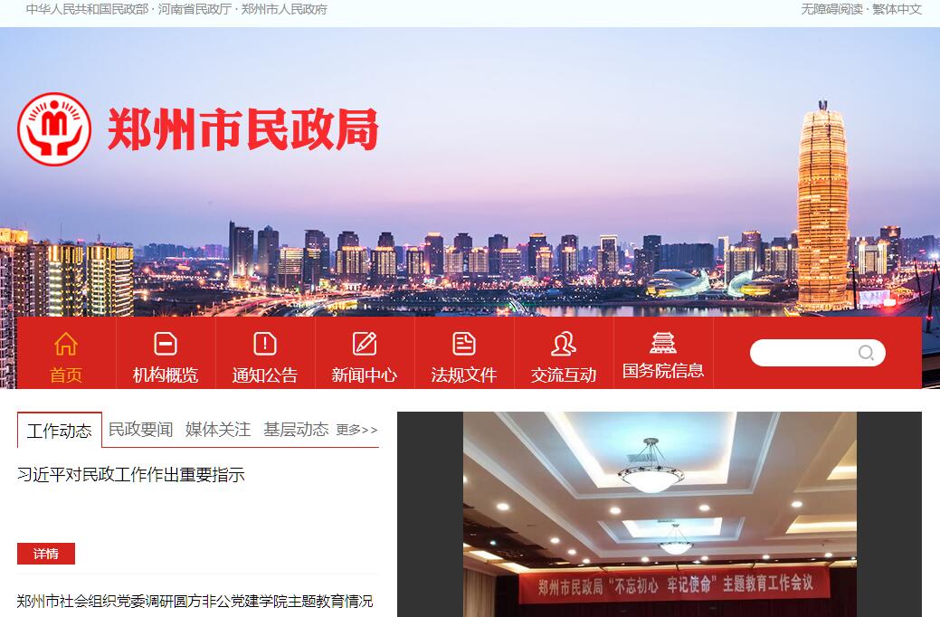 郑州市民政局主要职责:(一)贯彻民政工作法律、法规和方针、政策,拟订全市民政事业发展规划和民政工作政策,起草有关地方性法规、规章草案并组织实施和监督检查,指导全市民政工作的改革与发展。(二)拟订全市社会团体、社会服务机构等社会组织登记和监督管理办法并组织实施,依法对社会组织进行登记管理和执法监督。(三)拟订全市社会救助政策、标准,统筹社会救助体系建设,负责城乡居民最低生活保障、特困人员救助供养、临时救助、生活无着流浪乞讨人员救助工作,组织开展低收入家庭经济状况核对工作。(四)拟订全市城乡基层群众自治建设政策并组织实施,提出加强和改进城乡基层政权建设的建议,指导城乡基层民主选举、民主决策、民主管理和民主监督工作,推动城乡基层事务公开和民主政治建设。(五)拟订全市行政区划、行政区域界线和地名管理政策;负责全市乡镇(街道)以上行政区划的设立、撤销、界线变更及政府驻地迁移的审核工作,负责开展地名管理工作,负责市界勘定和管理工作,指导县(市)区行政区域界线勘定和管理工作。(六)负责指导全市婚姻登记工作,拟订婚姻管理政策并组织实施,推进婚俗改革。(七)拟订全市殡葬管理政策、服务规范并组织实施,推进殡葬改革。(八)拟订全市残疾人权益保护政策,统筹推进残疾人福利制度建设,指导残疾人特殊教育和康复工作。(九)统筹推进、督促指导、监督管理养老服务工作,拟订全市养老服务体系建设规划、政策、标准并组织实施,承担老年人福利和特殊困难老年人救助工作。(十)拟订全市儿童福利、孤弃儿童保障、儿童收养、儿童救助保护政策、标准并组织实施,健全农村留守儿童关爱服务体系和困境儿童保障制度。(十一)组织拟订全市促进慈善事业发展政策,组织、指导社会捐助工作,负责全市福利发行管理工作。(十二)拟订全市社会工作、志愿服务政策,会同有关部门推进社会工作人才队伍建设和志愿者队伍建设。(十三)做好已取消行政审批事项的服务和监管工作。(十四)完成市委、市政府交办的其他任务。
