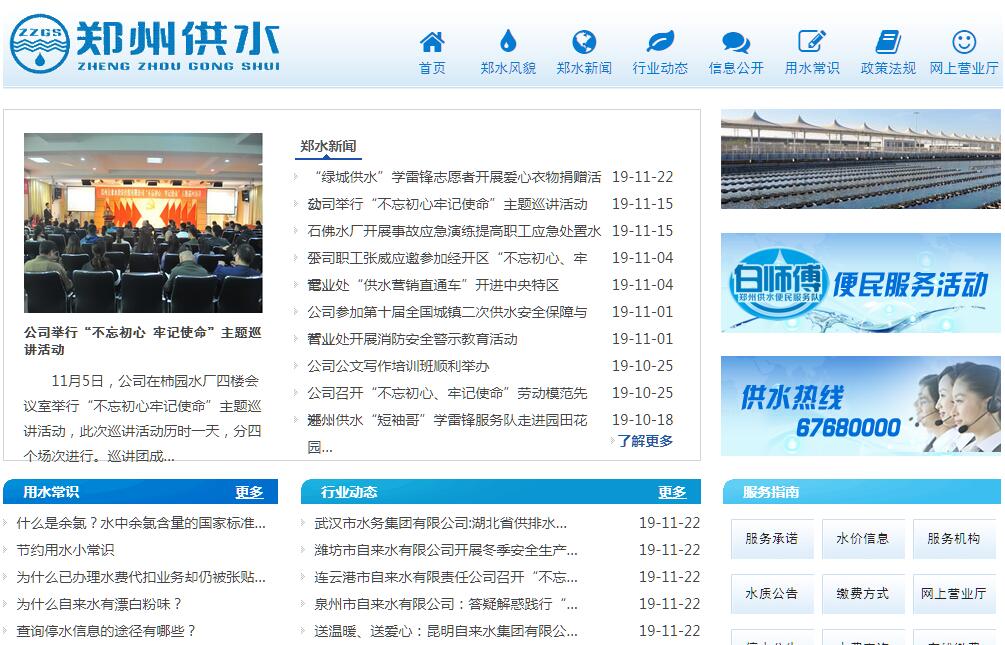 郑州自来水投资控股有限公司成立于1953年,2009年12月4日经市国资委批准,由全民所有制企业改建为国有独资的有限责任公司,属国有大型二类供水企业。现有水厂8座:柿园水厂、白庙水厂(现中法原水公司)、石佛水厂、东周水厂、刘湾水厂、航空港区一水厂、罗垌水厂、侯寨水厂。供水能力187万立方米/日。城市供水水源以南水北调水为主、以黄河地表水和黄河侧渗地下水为补充,以水库水为备用。累计供水管网长度4882公里,供水覆盖范围包括郑州市区、郑东新区、航空港区以及荥阳市区等区域,供水面积620平方公里,供水用户130多万户,服务人口630余万人。公司拥有华山路营业厅、中原路营业厅、经七路营业厅、商城路营业厅、商鼎路营业厅等5个营业厅,进驻市政服务中心办事大厅、航空港政务服务大厅,对接市内5个不动产大厅窗口服务,并通过公司门户网站网上营业厅向市民提供报装、过户、报修、水费查缴等服务。近年来,公司把城市供水作为重要民生工程来抓,不断增强企业社会责任感和使命感,以建设促发展,以经营增效益,努力推进工程建设和生产经营协调发展,提升城市供水建设管理水平,取得了可喜成果。以新建和改造大口径干管为重点,逐步建立起各水厂之间“互联互通、互为备用”的供水干管应急支撑体系;以南水北调水源转换黄河水和既有水厂深度处理工艺技术改造为重点,新建刘湾、航空港区、罗垌、侯寨4座水厂,完成柿园、白庙两大水厂改造和南水北调水源转换,新增城市供水能力86万立方米/日,供水覆盖范围由主城区扩展到航空港区、郑东新区及荥阳市区等区域,逐步形成以南水北调为主,黄河水及地下水为补充的多水源共同保障体系;以“大郑州、大供水、大调度”为重点,逐步形成“全市供水规划、供水建设、供水生产、管网管理、客户服务”五位一体统一、高效的数字化指挥管理体系。三大战略体系建设,使城市供水安全性、稳定性显著增强,有力支持了郑州市的国家中心城市建设。公司始终把城市供水作为企业履行社会责任、贯彻落实党和国家关注民生改善民生的直接体现和具体实践,以“保障供水、提高水质、提升服务”为工作目标,强化水源保障,规范制水生产、供水调度和抢修服务,加快推进城市供水工程规划和建设,统筹城乡供水一体化和区域供水一体化,提高城市供水综合承载力。