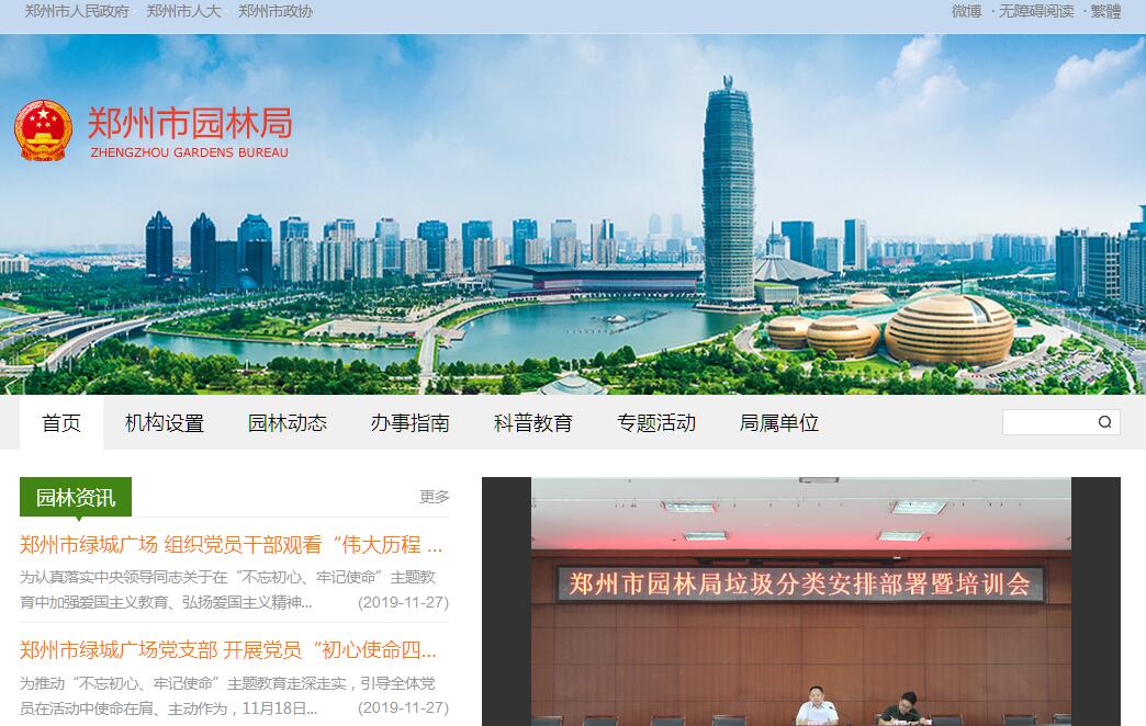 郑州市园林局主要职责:(一)贯彻执行国家、省、市有关城市园林绿化建设管理的方针、政策、法律和法规;拟订全市园林绿化地方性法规、规章和实施办法,经批准后组织实施。(二)负责编制并组织实施全市城市园林绿化中、长期发展规划、城市绿地系统规划和年度工作计划,并监督实施。(三)承担城市规划区内城市道路绿化、各类综合性公园、广场的建设管理工作职责;负责市财政投资的其他园林绿化工程建设管理工作。(四)负责全市园林绿化行业管理、业务指导;负责监督检查城市规划区内城市园林绿化建设管理工作;负责全市公园绿地、道路绿化、生态廊道、防护绿地等日常管护的检查、督导、考评工作。(五)负责全市城市园林绿化工程质量监督管理工作。(六)会同有关部门审核城市规划区内的建设项目中的配套绿地指标和绿化设计方案,参与竣工验收;负责审核公园绿地、防护绿地、道路绿化、生态廊道及重点城市绿化项目的设计方案。(七)负责制定全市园林绿化管理养护等级标准并监督实施;负责园林绿化植物保护、生物多样性保护、检疫工作;承担城市古树名木管理保护职责。(八)负责市区建成区内树木砍伐、移植和绿地临时占用的审批工作。(九)负责制定全市园林绿化科技发展规划、科研计划,并组织重大园林科技项目攻关和科技成果的推广应用;负责城市园林绿化资源普查和园林信息收集工作。(十)负责机关和局系统国有资产监督管理和财务审计工作。(十一)做好已取消行政审批事项的服务和监管工作。(十二)完成市委、市政府交办的其它任务。