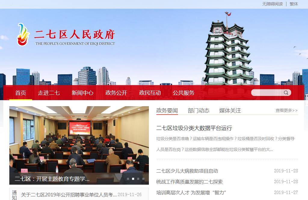 二七区综合实力不断提升。初步预计,2018年地区生产总值完成637亿元,增长9.8%;社会消费品零售总额预计完成499.3亿元,增长9.6%;一般公共预算收入完成32亿元,同比增长9.1%;规模以上工业增加值同比增长7.3%;固定资产投资同比增长14.6%。基本解决执行难、“智慧督查”等多项工作,经验成效在全国、省市进行交流;连续3年荣获郑州市综合考核工作优秀单位,2018年荣获全国“综合实力、最具投资潜力、创新创业、绿色发展”四个百强区。二七区历史悠久、文化厚重。有汉代民居邓公寨、明代周悼王陵、清代民居“天井院”等众多历史遗迹;老奶奶庙旧石器时代遗址将中华文明探源向前推进了3-5万年;铭功路出土的商代青釉瓷尊,把中国瓷器烧造史提前了1000多年;阎氏陶瓷、郑商瓷等瓷器已走出国门、走向世界。百年老街德化步行街的“商文化”精神传承至今;二七纪念塔成为河南省零公里点标志,郑州烈士陵园等留下了浓郁的红色文化。二七区交通便利、通讯快捷。京广、陇海两条铁路大动脉在境内交汇,素有中国铁路“心脏”之称。区内有全国最大的铁路枢纽站——郑州火车站、河南省最大的汽车客运站——郑州客运中心站,中原地区最大的电力、电信、邮政枢纽位于辖区。郑少高速、郑尧高速、西南绕城高速穿境而过,城区距新郑国际机场仅30分钟车程。二七区生态资源丰富、近郊旅游便利。西南部多丘陵沟壑,地形地貌独特,旅游资源丰富,有5万亩生态涵养林、15公里樱桃沟、4200多亩郑州树木园以及“南水北调”6.7公里长的生态景观带。建成区绿地率达到38.5%,绿化覆盖率达到44.3%,人均公共绿地14平方米。已培育出以烤鱼沟、梨园村、玉泉山庄为代表的特色休闲旅游农业,打造了郑州樱桃节、葡萄节、浪漫赏花游、秋季采摘游等一系列近郊旅游品牌。二七区公共资源丰富、社会服务体系完善。拥有郑州大学、中国人民解放军防空兵指挥学院、郑州航空工业管理学院、中州大学、黄河科技学院、郑州卫校、郑州测绘学校等大、中专院校;有核工业部第五设计院、中国船舶重工集团七一三研究所等中央、省部级科研机构,有郑州大学第一附属医院、河南省妇幼保健院、河南武警总队医院、郑州市骨科医院等省、市级医院,金融、证券、通讯、餐饮、文化娱乐等商业服务设施齐全。