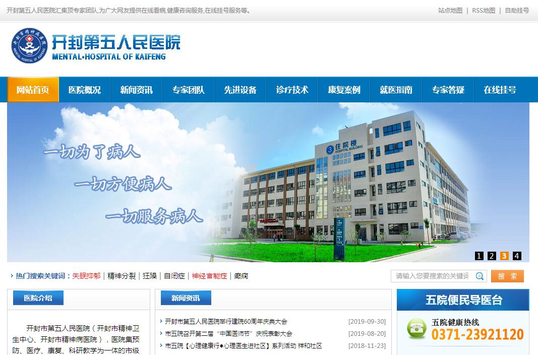 开封市第五人民医院(开封市精神卫生中心、开封市精神病医院),医院集预防、医疗、康复、科研教学为一体的市级公立精神卫生专科医院。是省(市)职工、城乡居民医保定点医疗机构,是开封市心理咨询中心、开封市精神疾病康复技术指导中心、开封市精神疾病鉴定中心。河南省精神疾病专家工作站也设在该院。开封市第五人民医院,始建于1959年,医院新院址位于华夏大道南侧金明大道东侧交叉口,占地73亩,建筑面积28700平方米,开放床位500张。医院现有职工330余人,专业技术人员230余名,拥有近30名主任医师和副主任医师组成强大的精神科专家团队和心理治疗团队。现开设七个病区,其中两个封闭男病区、两个封闭女病区、一个心理康复病区,一个中西医结合病区、一个物质依赖病区。年门诊量近8万人次,年住院病人4000余人次。实现了住院环境园林化,病房设施标准化,住院生活家庭化,治疗手段多样化。医院开设中医特色诊疗,引进新技术、新方法,运用中医药及中西医结合疗法治疗焦虑、抑郁、失眠、更年期综合征等疾病具有显著疗效。医院配备中医药制剂室,自制中药丸剂三个品种取得省级制剂批准。一分耕耘,一分收获。历经半个多世纪的风雨变革,我院在市委、市政府和市卫健委党委的关心支持下,经过深化改革、挖掘潜力,开拓创新,近年来,医院在领导班子的带领下,全员干部职工发扬“仁爱、博学、敬业、求是”的医院精神;坚持“以病人为中心,全心全意为病人服务”的治院方针,以管理求发展,以质量求生存;不断提高服务质量和医疗水平,以患者满意为目标,服务于患者,回报社会,切实维护群众的切身利益。医院狠抓内涵建设,在全院推行优质护理服务。长期以来坚持“三级查房制度”、“三查七对制度”等各项医疗管理制度,力求为来院病人提供更优质、更安全的服务。医院重视人才培养,倡导科技兴院,采用新技术、探索新疗法,使医院整体医疗水平不断提高。开封市第五人民医院以其良好的形象、优美的环境,优质的服务,精湛的技术在省内外享有较高的声誉,为豫东地区精神卫生事业做出了应有的努力和贡献。