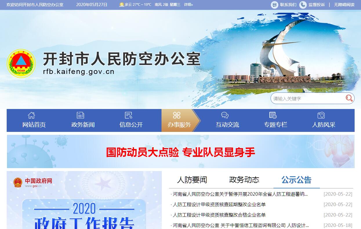 开封市人民防空办公室门户网站是对外传播人防知识,宣传开封人防的重要窗口。开封市人民防空办公室为市国防动员委员会常设办事机构,是市政府工作部门。其主要职责是:(一)贯彻执行国家人民防空法律、规章和方针政策。(二)负责拟订全市人民防空建设规划、城市平战综合防护建设发展规划及相关专项规划并组织实施;参与拟订重要经济目标防护建设总体规划、城市地下空间暨人民防空工程综合利用规划并协同实施。(三)负责组织实施人民防空设施建设相关审核审批。(四)负责制定战时城市人口、战备物资疏散和掩蔽计划,负责疏散基地、疏散地域建设。(五)监督管理全市人民防空设施建设、维护和使用。(六)负责组织开展人民防空执法监管工作。(七)会同有关部门指导开展城市和重要经济目标单位防护工作;组织拟订修订城市人民防空袭方案,指导拟订重要经济目标防护方案,组织开展城市人民防空演训。(八)指导开展人民防空群众组织建设。(九)开展人民防空日常战备工作。(十)组织开展人民防空宣传教育工作。(十一)组织开展人民防空科研工作,推进人民防空科技创新和科研成果转化应用推广。(十二)组织实施人民防空信息化体系能力建设。(十三)负责人民防空平战结合工作,利用人民防空战备资源参与抢险救灾、服务民生、改善民生,为应急救援提供支持。战时组织开展城市人民防空行动。(十四)推进人民防空建设与经济社会融合发展。(十五)落实人民防空队伍建设要求,对县(区)人民防空办公室主任、副主任的任免提出意见(十六)负责依法征缴人民防空工程易地建设费。(十七)完成市委、市政府、军分区交办的其他任务。