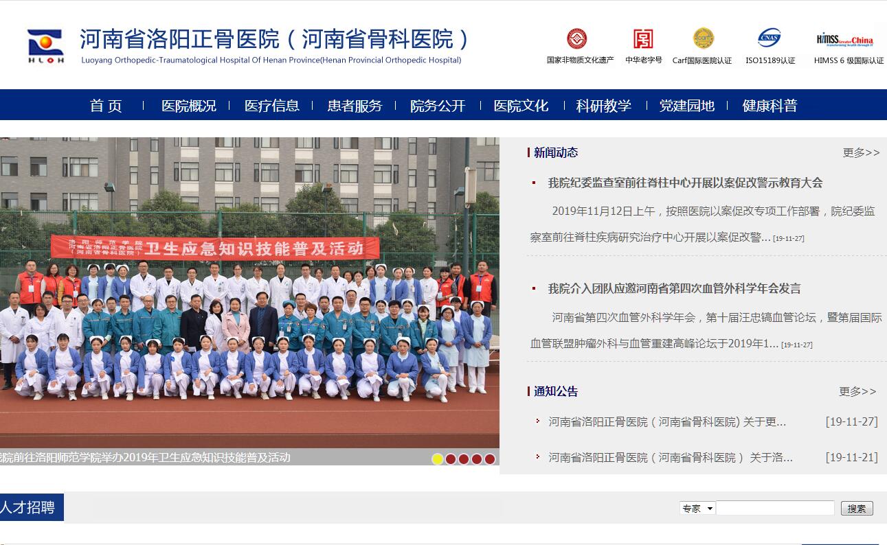 河南省洛阳正骨医院河南省骨科医院是在具有224年历史的平乐郭氏正骨基础上发展起来的一所集医疗、教学、科研、产业于一体的三级甲等公立专科医院。平乐郭氏正骨(洛阳正骨)起源于清朝嘉庆年间的孟津县平乐村,因其医术精湛、疗效显著,被老百姓亲切称为“平乐正骨”、“白马寺正骨”。1956年,医院创始人、平乐郭氏正骨第五代传人高云峰受到毛主席、周总理的亲切接见。同年建立洛阳正骨医院,1958年建立河南省平乐正骨学院,1959年建立洛阳正骨研究所(2006年更名为河南省正骨研究院),经过50多年的发展和建设,已成为一所集医疗、教学、科研、产业于一体的三级甲等省级中医骨伤专科医院,2013年经省政府批准增挂“河南省骨科医院”, 2015年增挂“河南省康复医院”。近年来,医院坚持走“专科化、特色化、品牌化、一体化、国际化”的发展道路。“平乐郭氏正骨法”(洛阳正骨)被评为“中国非物质文化遗产”,演绎洛阳正骨传奇历史的电视剧《大国医》在央视及20多个省级卫视播出,并荣获中宣部精神文明建设“五个一工程”奖,拍摄了展示洛阳正骨传统疗法的微电影《缘来是你》,2010年和2014年,医院两次通过国际医疗卫生机构认证联合委员会(JCI)认证和国际实验室标准(ISO15189)认可,2015年,医院又通过医疗卫生信息和管理系统协会(HIMSS) 6 级国际认证和洛阳市“市长质量奖”评审。先后获得 “全国卫生系统先进集体”、“中医名院”等荣誉称号。医院现在是国家中医骨伤诊疗中心,国家临床重点专科建设单位(骨伤科、康复科、风湿病科、护理学),国家中医重点专科项目建设单位(骨伤科、康复科、风湿病科、护理学、推拿科、肿瘤科)和国家中医药管理局骨伤协作组大组长单位,国家中医药管理局重点学科建设单位(中医骨伤科学、临床中药学),国家博士后科研工作站,国家药品临床研究基地,国家组织工程中心河南分中心,国家工伤康复试点机构,河南省骨科疑难疾病国际会诊中心,河南省中医骨伤工程技术研究中心以及20多个省级骨伤骨病研究治疗中心。医院总占地面积约700亩,具有“一院、两地、五址”的区域发展新格局,现分为洛阳东花坛院区、郑州院区、康复院区(河南省康复医院)、白马寺院区和洛阳正骨医药科技股份有限公司共五个区域,设置有设施先进的影像中心、检验中心、静脉配置中心等,拥有生化、生物力学等8个基础实验室,主办杂志《中医正骨》。现有职工2000余人,临床科室60余个,核定床位2450张,开放床位1500张。每年诊疗病人约23万人次,其中省外病人占诊疗病人的23%左右。十三五期间,洛阳正骨将以“五型五化五院区”为发展思路,以内涵建设和提质增效为重点,以骨科“预防、治疗、康复”业务发展为主线,主动适应经济发展新常态和“互联网+”新业态,与兄弟单位加强合作,为加快建设健康河南、增进群众健康福祉做出新贡献。