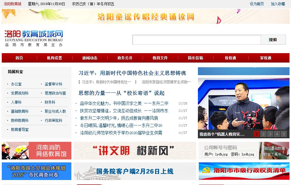 洛阳市教育局主要职责:(一)贯彻落实国家、省教育改革与发展的法律、法规、规章和方针、政策、规划。拟订有关教育的地方性法规、规章草案并监督实施;负责教育理论研究和宣传工作;贯彻执行上级关于教育系统劳资、人事管理工作的政策和规章制度,提出我市相关政策建议和实施办法。(二)负责全市基础教育、职业技术教育、中等专业教育、成人教育、师范教育、特殊教育的统筹规划、协调管理;研究拟订全市教育事业发展规划及年度计划;指导全市教育教学改革;审批和管理社会力量办学;负责全市教育信息的统计工作。(三)统筹管理本部门教育经费和教育费附加;参与拟订教育基建投资和教育经费管理的政策并组织实施;负责国内外对我市教育援助、捐赠的协调服务工作。(四)负责指导全市基础教育工作;负责推进全市义务教育均衡发展和促进教育公平;督促、落实中等和初等教育学校(含社会力量举办学校)设置标准、教学基本要求、教学基本条件。指导协调各县(市、区)、各部门的教育工作,组织对义务教育均衡发展、扫除青壮年文盲工作的督导与评估。(五)指导以就业为导向的职业教育发展与改革,落实中等职业教育教学指导文件和教学评估标准。(六)负责各类高校、中等专业学校在我市的招生;负责师范院校毕业生就业派遣;制定市属师范学校、中小学、幼儿园的招生计划并组织实施。(七)规划并指导全市学校的思想政治工作、品德教育工作、体育、卫生与艺术教育工作、国防教育工作;指导教育社团工作。(八)主管全市教师工作。负责高级中学、中等职业学校教师资格的认定,指导县(市、区)开展初中、小学、幼儿园教师资格认定工作;按照规定权限负责有关干部管理工作;负责教育系统的表彰奖励;归口管理教师和教育管理人员继续教育;指导各级各类学校内部人事与分配制度改革。(九)负责管理教育系统的科研、外事和信息化建设工作。(十)负责直属各级各类学校的基本建设、修缮和学校布点、增设、撤销等事项;组织落实图书资料、实验室、电教室的建设工作。(十一)落实国家语言文字工作的方针、政策;负责普通话推广工作。(十二)负责本部门及所属事业单位网上名称管理工作。(十三)承办市政府交办的其他事项。