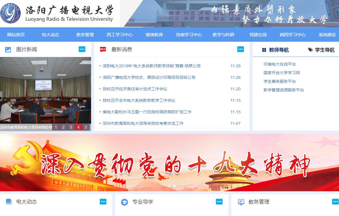洛阳广播电视大学是一所根据现代教育理论和利用现代电子技术进行远程教育的开放性高等学校。校址位于十三朝古都洛阳市中心西工区凯旋东路,交通方便,环境优美。学校创办于1979年,为正县级教育事业单位。现有中层处室8个,分为校本部和洛南新区两个校区。占地面积60余亩,拥有两座共8400平方米的教学大楼、4000平方米的学生宿舍楼、3600平方米的教工宿舍楼,功能齐备的学生餐厅和宽阔的运动场地。全市县级电大分校和教学点14个,电大系统在职教职工300余人;校本部教职工61人,其中副高以上职称6人,中级职称25人,专兼职教师80人。建校28年来,共开设本科专业13个、专科专业49个、中专专业34个,在校生8000余人。现已具有开放教育本科、开放教育专科、成人高等教育专科、网络学院、成人中专、高教自考、职业培训等多种教育形式,形成了多层次、多规格、多形式的办学格局。截止2006年底,共培养本科毕业生1800余人,大专毕业生30000余人、中专毕业生近6000人。他们遍布我市各行各业,不少人已成为本单位的领导骨干、业务骨干和技术骨干。学校以网络及多媒体视听为主要教学手段,具有教学形式活、讲授知识新、传播速度快、教师水平高等特点。近年来,学校加快了远程教育基础建设的步伐,先后投资近130万元,建成了包括卫星接收系统、远程双向实时教学系统、内部办公的综合性校园网及配套的远程教育设施,通过互联网络实现了电大系统教学资源的共享。目前学校已拥有完善的卫星、VBI、IP系统,各种教学资源可以及时接收、保存和发布。已建成了多媒体教室、网络教室、语音教室、多媒体视听阅览室、计算机实验室、CAI课件室、演播室及校内闭路电视系统、双向视频系统、电话和电子答疑系统,并自主开发了开放教育在线平台,基本建成了卫星电视系统和计算机网络相配合的交互式现代远程教育教学系统,初步实现了从第二代到第三代远程教育的飞跃。学校全面贯彻党的教育方针,坚持“以教学为中心,全面提高教育质量,为当地经济建设和社会发展培养合格人才”的办学指导思想,艰苦奋斗,积极开拓,努力改善办学条件,围绕培养学生的技能和创新精神,不断深化教学改革,全面加强教学管理,各项工作均取得明显成绩,连年被省电大评为教学、教学管理、考务管理先进单位;先后获得河南省教委“优秀学校”、中央电大“全国广播电视大学信得过考区”、“全国教育网站系统示范单位”、“全省电大系统先进办学单位”等称号。