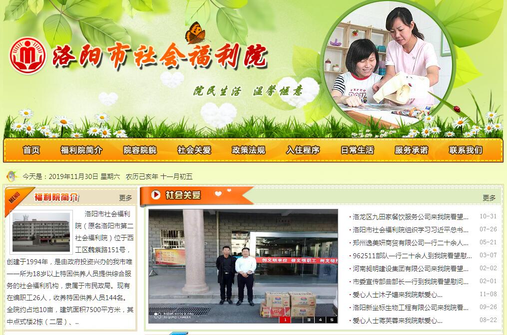 洛阳市社会福利院(原名洛阳市第二社会福利院)位于西工区魏紫路151号,创建于1994年,是由政府投资兴办的我市唯一一所为18岁以上特困供养人员提供综合服务的社会福利机构,隶属于市民政局。现有在编职工26人,收养特困供养人员144名。全院约占地10亩,建筑面积7500平方米,其中点式楼2栋(二层)、公寓楼1栋(六层),可设床位150张。自1994年10月开业以来,按照“以民为本,为民解困,为民服务”的宗旨,认真做好特困供养人员的服务及管理工作。我院特困人员的来源:一是由市儿童福利院送养的年满18周岁以上的孤残人员。二是由市救助管理站送养的流浪乞讨人员。三是由城市各辖区送养的人员。社会福利院是精神文明建设的重要阵地,是把党的温暖送到千家万户的窗口单位。建院至今,院支部十分重视精神文明建设,并把精神文明建设纳入到日常工作中。经常教育干部职工,把院民当亲人,视老人如家人,加强工作责任心。院工作人员每天为老人端饭、喂药、洗脸、梳头、修剪指甲,帮助生活不能自理老人翻身、按摩、铺床、叠被,打扫卫生,多年如一日,无私奉献,唱响了一曲精神文明的赞歌。经过全院干部职工的积极努力、辛勤工作,院取得了不少成绩,先后荣获“省一级福利院”、“省级文明达标单位”、“省级卫生先进单位”、“市文明单位”、“市庭院化单位”、“市文明安全公寓”、“巾帼文明示范岗”、“十星级文明单位”、“创建国家卫生城市模范单位”、“综合治理先进单位”、“民政工作先进单位”、“廉政建设先进单位”、“精神文明建设工作先进单位”等荣誉称号。为进一步提高院民的生活和服务质量,院将严格按照局“四、六、八”行风服务规范要求,认真贯彻落实院提出的“六前、六心、六做到”文明服务承诺,积极与社会各界开展创建活动,倡导尊老、爱老、敬老文明之风,号召职工做文明市民,做文明职工,树立好民政人的良好形象,为创建国家文明城市做贡献。