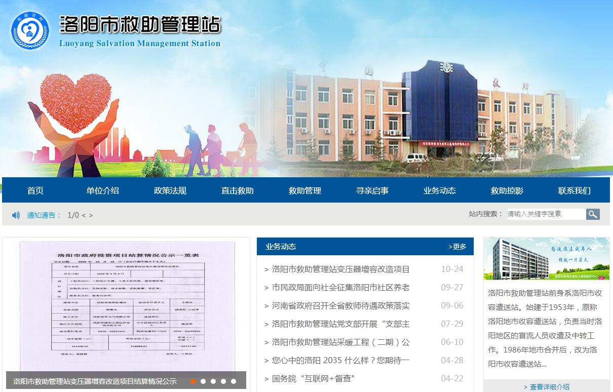 洛阳市救助管理站前身系洛阳市收容遣送站。始建于1953年,原称洛阳地市收容遣送站,负责当时洛阳地区的盲流人员收遣及中转工作。1986年地市合并后,改为洛阳市收容遣送站。2003年8月,根据国务院《城市生活无着的流浪乞讨人员救助管理办法》,更名为洛阳市救助管理站,负责洛阳市城市生活无着的流浪乞讨人员救助管理工作。洛阳市救助管理站原址在老城区图书馆街10号院,1980年初搬迁至道北陵园路副1号,1998年因城市建设需要,由市委、市政府投资在邙山镇苗北村建设新站,2006年7月救助管理站迁入新址。现址位于定鼎路与310国道交叉路西300米,占地面积24.5亩,建筑面积12696平方米,可同时容纳260人接受救助。洛阳市救助管理站属正科级建制参照公务员管理的事业单位,编制44名,政府购买服务50名。内设:办公室、救助管理科、医疗救助科、流动救助科、流浪未成年人保护教育中心、财务科、后勤科、安保科。自2003年由洛阳市收容遣送站更名为洛阳市救助管理站以来,截止2017年,洛阳市救助管理站共救助9万余人次。先后荣获国家一级救助管理机构、河南省省级文明单位等荣誉,其中,流浪未成年人心理咨询矫治工作和流浪乞讨人员救助管理源头预防工作分别走在全国和全省前列。