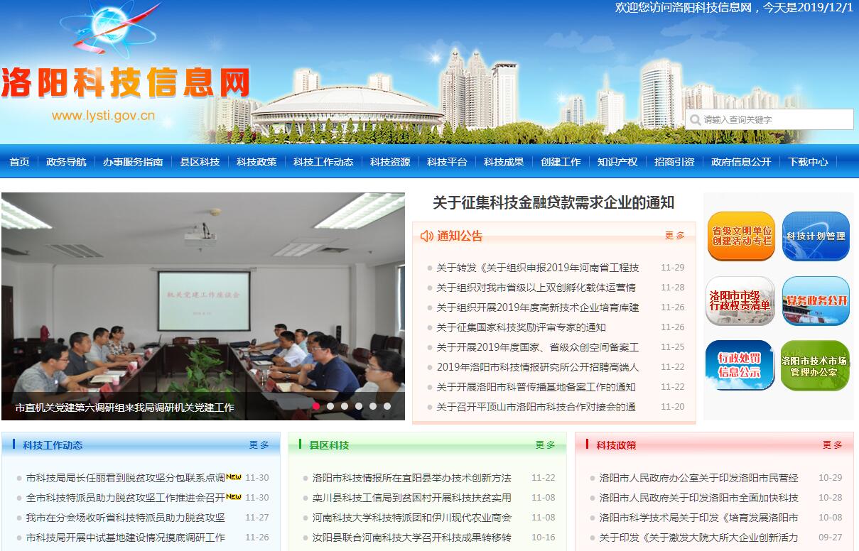 洛阳市科技局主要职责:(一)贯彻执行国家、省科技工作法律、法规、规章和方针、政策;提出全市科技发展战略的建议;牵头拟订激励自主创新的地方性法规、规章草案和政策措施,并组织实施和监督;提出全市科技体制改革的政策和重大措施建议,推进全市科技创新体系建设和科技体制改革工作。(二)牵头拟订全市科学和技术发展规划,确定全市科技发展的战略布局和优先发展领域;负责《洛阳市中长期科学和技术发展规划纲要》的实施;会同有关部门推进创新驱动发展战略实施。(三)组织制定多渠道增加科技投入的政策措施;会同有关部门统筹管理科技投入;提出科技资源合理配置的重大政策和措施建议,优化科技资源配置;拟订科技金融结合的政策措施,会同有关部门指导科技投融资工作。(四)会同有关部门拟订推动全市产学研融合发展等方面的政策措施,组织全市经济社会发展重要领域的重大关键技术攻关,负责全市科技计划的制定与组织实施。(五)负责全市高新技术发展与产业化工作。会同有关部门拟订高新技术产业化政策,推进全市高新技术发展及产业化工作;配合上级部门做好高新技术产业开发区的相关工作。 (六)制定科技成果转化和产业化政策,指导科技成果转化工作,组织相关重大科技成果应用示范;组织实施重大科技专项。(七)负责全市科技基础能力建设。提出全市科研条件保障规划和政策建议;负责全市科技基础条件平台、科技服务平台和企业技术创新科技支撑平台建设工作;会同有关部门加强科技基本建设;负责科技创新基地的规划布局、指导和监督;拟订全市科技服务业政策措施,推动科技服务业发展。(八)负责全市科技奖励工作;会同有关部门拟订科技人才队伍建设规划,提出相关政策建议;负责全市科技创新创业人才(团队)建设。(九)拟订全市对外科技合作与交流的政策措施;负责全市对外及涉港澳台地区科技合作与交流事宜;组织实施国际科技合作计划。(十)会同有关部门拟订全市科学技术普及工作规划,指导全市科普工作;促进科技咨询、评估等科技中介组织的发展,推进科技服务体系的建设;负责全市技术市场的建设管理。(十一)拟订全市科技促进农村和社会发展的政策措施,研究解决农村和社会发展的重大科技问题。(十二)负责本部门及所属事业单位网上名称管理工作。(十三)承办市政府交办的其他事项。