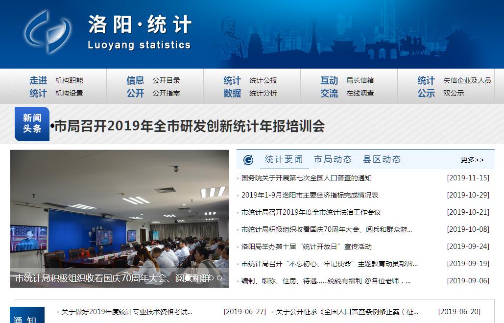 洛阳市统计局主要职责:(一)组织领导和协调指导全市统计工作,确保统计数据真实准确及时;贯彻执行国家、省统计政策、规划、基本统计制度和统计标准,制定我市统计制度和统计标准;贯彻执行国家、省统计法律、法规及规章,拟订统计地方性法规、规章草案;负责基本单位名录库建设和维护管理。(二)负责重大案件查处,组织协调统计执法工作,负责提出统计违纪违法责任人处分处理建议,承担法律法规赋予市级统计行政部门履行的其他执法职责,监督指导县(市、区)统计行政执法工作。(三)贯彻执行国家、省国民经济核算制度,建立健全全市国民经济核算体系和统计指标体系,配合省统计局核算全市生产总值,组织核算各县(市、区)生产总值,监督管理各县(市、区)国民经济核算工作。(四)会同有关部门贯彻落实全国、全省重大国情国力普查计划、方案,组织实施全市人口、劳动工资、经济、农业等国情国力普查和投入产出调查等大型专项调查,汇总、整理和提供有关国情国力方面的统计数据。(五)组织实施农林牧渔业、工业、建筑业、批发和零售业、住宿和餐饮业、房地产业、装卸搬运和仓储业、互联网和相关服务、软件和信息技术服务业、租赁和商务服务业、居民服务、修理和其他服务业、文化体育和娱乐业等统计调查,组织实施能源、投资、人口、劳动工资、科技、企业创新、文化产业、社会发展基本情况、环境基本状况等统计调查,收集、汇总、整理和提供有关调查的统计数据;综合整理和提供地质勘查、资源、房屋、对外贸易、对外经济、交通运输、邮政、信息传输、财政金融税收、旅游、教育、卫生、社会保障、公用事业等全市性基本统计数据。(六)组织实施规模以下工业抽样调查、规模以下工业企业成本费用调查、建筑业小微企业抽样调查、小微企业固定资产投资情况调查、规模以下企业创新调查、限额以下批发零售住宿餐饮行业抽样与问卷调查、规模以下服务业抽样调查,开展调查情况分析研究;组织实施重要统计监测评价考核和社情民意调查。(七)组织各县(市、区)及市政府各部门的经济、社会、科技和资源环境统计调查;统一核定、管理、公布全市性基本统计资料,定期发布全市国民经济和社会发展情况的统计信息。(八)对国民经济、社会发展、科技进步和资源环境等情况进行统计分析、统计预测和统计监督,向市委、市政府及有关部门提供统计信息和咨询建议。(九)依法审批或备案市级各部门统计调查项目;指导专业统计基础工作、统计基层业务基础建设;组织建立全市服务业统计信息共享制度和发布制度;建立健全统计数据质量审核、监控和评估制度,开展对重要统计数据的审核、监控和评估。(十)协助县(市、区)管理统计局局长;指导全市统计专业技术队伍建设;监督管理各县(市、区)政府统计部门由中央、省、市财政提供的统计经费和专项基本建设投资。(十一)建立并管理全市统计信息自动化系统和统计数据库系统,组织制定各县(市、区)及市政府各部门统计数据库和网络的基本标准和运行规则;指导县(市、区)统计信息自动化系统建设。(十二) 完成市委、市政府交办的其他任务。