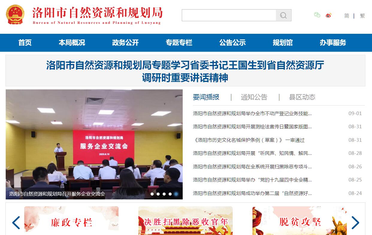 洛阳市自然资源和规划局是主管全市国土资源、矿产资源和测绘管理的市政府工作部门,其主要工作职责是:(一)贯彻执行国家、省土地、矿产、测绘管理法律、法规,拟订全市国土资源地方性法规、规章草案及有关政策。组织制定全市国土资源发展规划,开展国土资源经济形势分析,研究提出全市国土资源供需总量平衡的政策建议。落实国家、省国土资源宏观调控政策,参与全市宏观经济运行、区域协调、城乡统筹的调查研究,拟订全市涉及国土资源的调控政策措施。(二)负责组织编制和实施洛阳市土地利用总体规划、土地利用年度计划、矿产资源总体规划和专项规划;组织指导、监督各县(市、区)土地利用总体规划、矿产资源总体规划和专项规划的编制与实施;组织编制全市地质科技规划;负责审核本级矿产资源勘查、开发、保护规划区;指导各县(市、区)编制本辖区地质旅游资源开发和保护规划。负责建设项目用地预审和城乡建设用地增减挂钩工作。(三)负责查处全市土地、矿产、测绘违法案件,监督检查全市国土资源管理部门行政执法和土地利用规划、矿产资源规划执行情况;依法保护土地所有者、土地使用者和矿业权人的合法权益。(四)负责贯彻落实国家耕地保护和开发政策;实施土地用途管制,指导全市耕地保护,特别是基本农田保护;组织管理、监督全市土地开发、复垦、整理工作。(五)负责全市土地征用、征收、转用管理;承办建设项目用地的审查、报批工作。(六)负责组织全市土地资源现状调查、变更调查、更新调查和动态监测工作;负责城乡地籍调查、土地权属确认管理。指导、调处土地权属纠纷;负责土地登记工作。(七)负责全市土地节约集约利用;组织实施土地开发利用标准;贯彻实施供地政策;拟订并组织实施年度国有建设用地供应计划;管理、监督政府土地储备、土地开发;组织实施国有建设用地使用权出让、租赁、作价出资、转让;组织、监督国有建设用地使用权招标、拍卖、挂牌出让工作;制定和更新基准地价,实施地价动态监测;组织实施土地利用动态巡查、闲置土地调查和处置工作;负责耕地质量等别和建设用地节约集约评价、更新工作;会同有关部门监督管理农村集体建设用地使用权的流转。(八)负责管理全市测绘地理信息工作;管理测绘单位资质、测绘成果、测绘地理信息市场和地图市场;维护测量标志;负责国土资源地理信息系统的建设和管理,监督基础地理信息获取与应用工作,为社会提供基础地理信息服务;组织协调地理信息安全监管工作;指导、协调全市地理信息产业建设。(九)负责全市矿产资源勘查、开发、保护和监督管理。规范监管矿业权市场;组织对矿业权人勘查、开采活动进行监督管理;组织地方级矿产督察员开展矿产督察工作。协调处理各种矿业纠纷,负责地矿行政复议、行政诉讼和行政赔偿工作。(十)负责全市矿业权管理。负责矿产资源储量管理;编制并组织实施矿业权设置方案;组织全市矿业权挂牌、拍卖、招标出让工作;对县(市、区)采矿权挂牌、拍卖、招标出让工作实施监督管理。(十一)负责组织监测、防治地质灾害,保护古生物化石和地质遗迹;依法管理水文地质、工程地质、环境地质勘查和评价工作;组织全市范围内地质旅游资源的调查与保护;监督管理市内具有重要价值的古生物化石产地、标准剖面等地质遗迹保护区。(十二)负责监督管理在本市开展的地质勘查项目;组织开展市财政出资的中、小型地质勘查工作;负责组织职权范围内的矿产资源储量报告的备案工作;配合辖区内地质勘查工作,处理各种地质勘查纠纷;筹集管理本市地质勘查基金。(十三)负责管理全市地矿科技、教育工作。组织协调大、中型地矿科技项目的实施,管理地矿科技成果;指导全市矿业权人开展科技兴矿活动,推进科技进步和科技开发工作。(十四)负责全市国土资源信息系统建设和管理。按有关规定发布耕地保护、土地审批、土地利用、出让、划拨、登记、地价、土地市场、测绘成果等信息,为经济社会发展提供基础数据和信息服务。(十五)负责协调市地矿行业的对外交流。在上级国土资源部门领导下监督管理中外合资、合作与外资在我市区域内开展的矿产资源勘查、开发项目;归口组织有关部门和人员参加有关国际组织的重大活动。(十六)负责申请各类国土资源管理专项资金,依法征收各类国土资源行政事业性收费;监督检查全市国土资源各类经费的管理和使用。负责分配上级拨付的国土资源专项经费;负责全市矿产资源补偿费、矿业权使用费和矿业权价款的征收和管理工作。(十七)负责全市不动产统一登记工作,建立不动产统一登记制度,承担不动产登记工作的行政管理职能和具体登记事务。负责各类不动产登记资料的管理和共享,负责不动产登记信息公开查询;负责不动产权属纠纷调处及行政复议、行政应诉等工作。(十八)负责本部门及所属事业单位网上名称管理工作。(十九)承办市政府交办的其它事项。