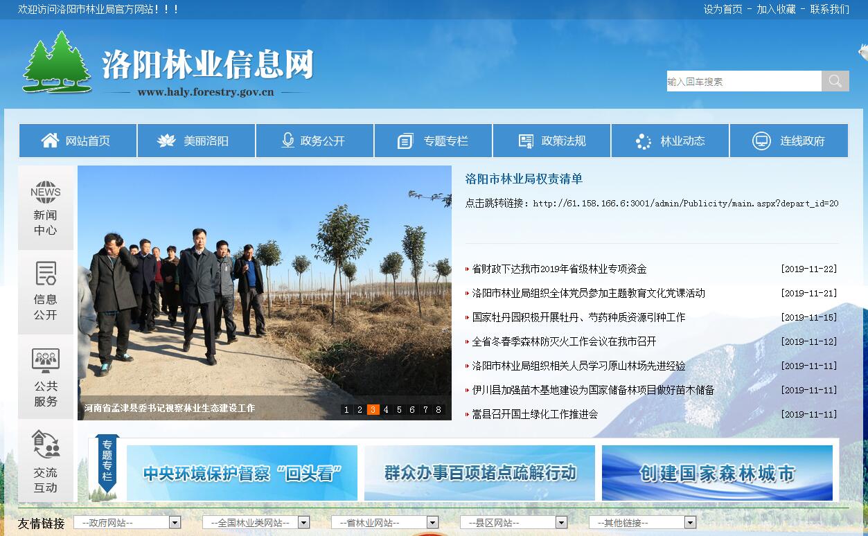 洛阳市林业局主要职责: 一、负责林业及其生态保护修复的监督管理。拟订林业及其生态保护修复的政策、规划、标准并组织实施,拟订相关地方性法规、规章草案。负责林业相关行政执法监管工作。组织开展森林、湿地、荒漠和陆生野生动植物资源动态监测与评价。二、组织林业生态保护修复和造林绿化工作。组织实施林业重点生态保护修复工程,指导公益林和商品林的培育,指导、监督全民义务植树、城乡绿化工作。指导林业有害生物防治、检疫工作。承担林业应对气候变化的相关工作。承担洛阳市绿化委员会日常工作。三、负责森林、湿地资源的监督管理。组织编制并监督执行全市森林采伐限额。负责林地管理,拟订保护利用规划并组织实施。指导公益林划定和管理工作,管理国有森林资源。拟订湿地保护规划,监督管理湿地的开发利用。指导基层林业工作站的建设和管理。四、负责监督管理荒漠化防治工作。组织开展荒漠化调查。组织拟订防沙治沙、石漠化防治建设规划,监督管理沙化土地的开发利用。五、负责陆生野生动植物资源监督管理。组织开展陆生野生动植物资源调查,拟订及调整市级重点保护陆生野生动物、植物名录,指导陆生野生动植物的救护繁育、栖息地恢复发展、疫源疫病监测,监督管理陆生野生动植物猎捕或采集、驯养繁殖或培植、经营利用,按分工监督管理野生动植物进出口。六、负责监督管理各类自然保护地。拟订各类自然保护地规划。根据授权,负责国家公园等自然保护地自然资源资产管理和国土空间用途管制。组织申报国家级自然保护地,提出新建、调整各类市级自然保护地的审核建议并按程序报批。组织审核世界自然遗产的申报,会同有关部门审核世界自然和文化双重遗产的申报,负责生物多样性保护有关工作。七、负责推进林业改革相关工作。拟订集体林权制度、国有林场等重大改革意见并监督实施。拟订农村林业发展、维护业经营者合法权益的政策措施,指导农村林地承包经营工作。开展退耕还林,负责天然林保护工作。八、拟订林业资源优化配置及木材利用政策,监督实施林业产业地方标准,组织指导林产品质量监督。指导生态扶贫相关工作。九、指导国有林场基本建设和发展,承担经济林、花卉管理工作。组织林木种子种质资源普查,组织建立种质资源库,负责良种选育推广,管理林木种苗生产经营行为,监管林木种苗质量。监督管理林业生物种质资源、转基因生物安全、植物新品种保护。十、负责落实综合防灾减灾规划相关要求,组织编制森林火灾防治规划和防护标准并指导实施,指导开展防火巡护、火源管理、防火设施建设等工作。组织指导国有林场开展防火宣传教育、监测预警、督促检查等工作。必要时,可以提请应急管理部门,以市级应急指挥机构名义,部署相关防治工作。依法履行林业安全生产监督管理职责,指导全市国有林场的安全监督管理工作。负责林业系统安全生产统计分析,依法参加有关事故的调查处理。十一、监督管理中央、省拨付我市的林业资金、市级林业资金及国有资产,提出林业预算内投资、国家和省、市级财政性资金安排建议;按规定权限审核国家、省、市级规划内和年度计划内投资项目。参与拟订林业经济调节政策,组织实施林业生态补偿工作。十二、负责林业科技、教育和外事工作,指导全市林业人才队伍建设。组织实施林业对外交流与合作事务,承担湿地、防治荒漠化、濒危野生动植物等国际公约履约工作。十三、负责拟订牡丹产业发展政策和中长期规划并组织实施,负责做好牡丹市场开发管理,引导牡丹产业发展。十四、完成市委、市政府交办的其他任务。