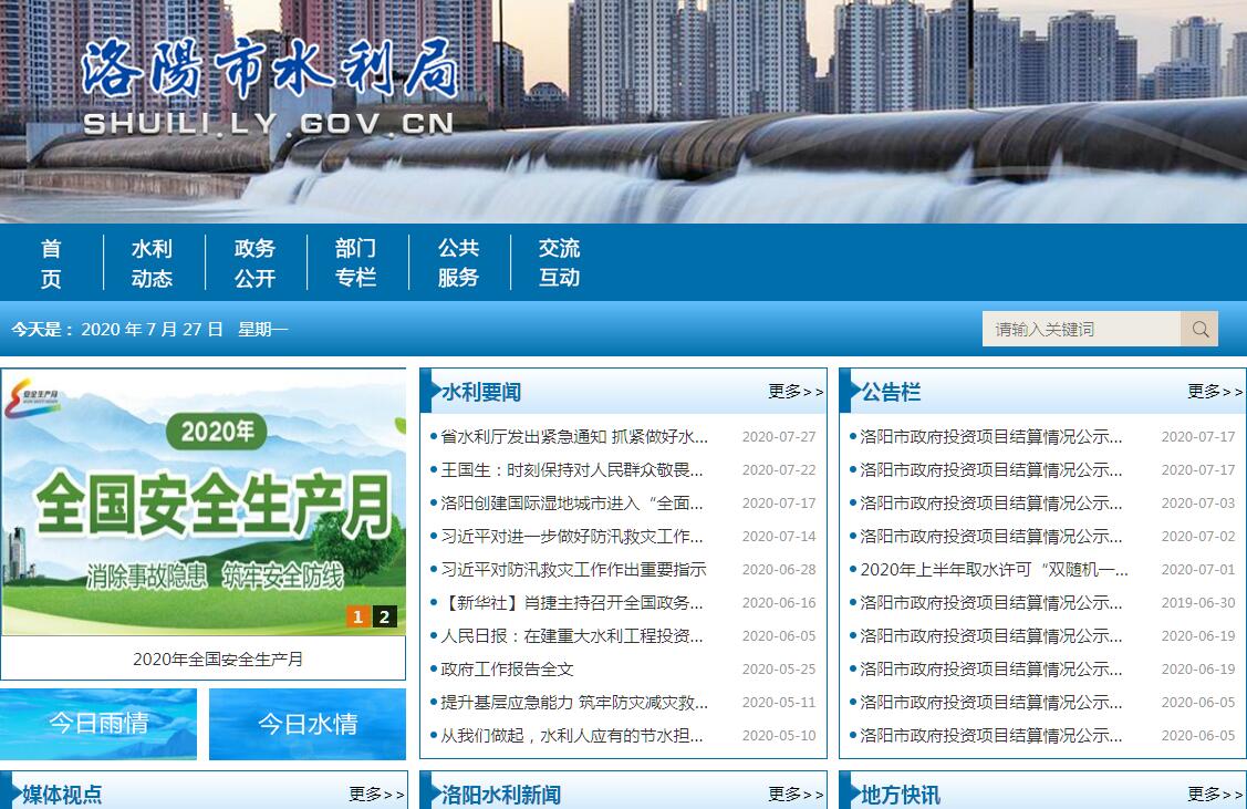 洛阳市水利局主要职责:(一)负责全市水资源的统一管理和监督工作。(二)负责保障水资源的合理开发利用。拟订有关地方性法规和规章草案并监督实施,指导和组织编制、审查、申报水利综合规划、专业规划、专项规划。(三)负责生活、生产经营和生态环境用水的统筹和保障。组织实施最严格水资源管理制度,拟订全市和跨县(市、区)水中长期供求规划、水量分配方案并监督实施。负责河湖渠库和重要水工程的水资源调度。组织实施取水许可、水资源有偿使用制度和水资源论证、防洪论证制度。指导水利行业供水和乡镇供水工作。(四)按规定制定水利工程建设有关制度并组织实施,负责提出中央、省级下达的和市级水利固定资产投资规模、方向、具体安排建议并组织实施,按市政府规定权限审批、核准规划内和年度计划规模内固定资产投资项目,提出中央、省和市级水利资金安排建议并负责项目实施的监督管理。按市政府规定权限,指导和组织编制、审查、申报水利基本建设项目建议书、可行性研究报告和初步设计,负责审批水利基本建设项目初步设计文件工作。(五)开展全市水利科技和对外合作工作。组织开展水利行业质量监督工作,指导监督全市水利行业执行国家和地方技术标准、规程规范,承担水利统计工作。指导水利系统对外合作交流。(六)负责水资源保护工作。组织编制并实施水资源保护规划,组织开展河湖水生态保护与修复,指导河湖生态流量水量管理以及河湖水系连通工作。指导饮用水水源保护工作,开展重要河湖渠库健康评估,指导地下水开发利用和地下水资源管理保护。组织指导地下水超采区综合治理。(七)负责节约用水工作。拟订全市节约用水政策,组织编制节约用水规划并监督实施,制定有关用水、节水标准。组织实施用水总量控制、用水效率控制、计划用水和定额管理等制度,组织、管理、监督节约用水工作,指导和推动节水型社会建设工作。(八)负责全市水利设施、水域及其岸线的管理、保护与综合利用。组织指导水利基础设施网络建设,指导河湖渠库及滩地的治理、开发和保护。指导水利工程建设与运行管理,负责水利工程质量监督检查工作,承担水利工程造价管理工作,组织实施具有控制性的或跨区域的重要水利工程建设、验收与运行管理工作,负责重要河流和重要水工程的调度工作,负责全市河道采砂的行业管理和监督检查工作。组织指导并监督检查全面推行河长制湖长制工作。(九)负责水土保持工作。拟订全市水土保持规划并监督实施,组织实施水土流失综合防治和全市水土流失监测、预报并公告。负责生产建设项目水土保持监督管理工作,指导水土保持重点建设项目的实施。(十)负责农村水利工作。管理中型灌排工程。指导农村饮水安全工程建设与管理工作,指导节水灌溉有关工作。指导农村水利改革创新和社会化服务体系建设。负责农村水能资源开发,指导小水电改造和水电农村电气化工作。(十一)负责重大涉水违法事件查处工作。指导全市水政监察和水行政执法,协调、仲裁并处理跨县(市、区)水事纠纷。负责水利行业安全生产工作,组织指导水库、水电站大坝、农村水电站的安全监督管理。指导水利建设市场的监督管理工作,组织开展水利工程建设监督和稽察工作。(十二)负责落实全市综合防灾减灾规划相关要求,组织编制洪水干旱灾害防治规划和防护标准并指导实施。承担水情旱情监测预报预警工作。组织编制重要河流和重要水工程的防御洪水、抗御旱灾调度和应急水量调度方案,按程序报批并组织实施。承担防御洪水应急抢险的技术支撑工作。(十三)负责水利工程移民管理工作。拟订全市水利水电工程征地移民地方性法规、规章草案和政策,编制移民规划、计划。组织指导移民搬迁、安置验收、监督评估和后期扶持工作。管理和监督移民资金的使用。负责监督全市水利水电工程征地移民工作。(十四)完成市委、市政府交办的其他任务。