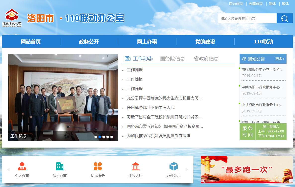 洛阳市行政服务中心(市行政事业单位效能促进局、市110联动办公室)成立于2002年6月25日,2007年11月加挂市行政事业单位效能促进局牌子、2011年5月与市110联动办公室合署办公(以下简称中心)。中心内设9个科室,分别为办公室、业务协调科、督查科、效能促进科、110联动督办科、110联动网民诉求办理科、110联动技术保障科、机关党委、监察室。市行政服务中心(市行政事业单位效能促进局、市110联动办公室)主要有五项职能,一是对窗口工作人员的工作情况进行监督管理,并负责窗口人员的年度考核工作;二是督查、规范进厅项目,确保行政审批项目按要求在中心集中公开办理;三是对各县(市、区)、市直各部门、各相关行业的效能工作进行监察督导,负责全市行政审批电子监察工作;四是负责全市110联动和网民诉求事项的受理、交办、协调、督办、检查、回访、考核、公示等工作;五是负责全市行风建设,组织协调全市有关部门、行业参加行风热线节目,并做好回访、督办、考核、公示等相关工作。目前,共有48个单位的256项行政审批项目在中心集中公开办理。110联动终端单位有109家,实现了各县(市、区)全覆盖。中心始终遵循文明、规范、廉洁、高效的服务宗旨,实行一个窗口受理、一站式审批、一条龙服务、一个窗口收费的运行模式;制定并推行每周7天工作制、预约服务、延时服务、上门服务、并联审批等一系列便民、高效的工作制度。110联动工作整合全市范围内各部门便民电话,建立全市统一的联动服务系统,实现全市统一受理和处置群众及网民诉求事项。办理模式得到中央领导的充分肯定,先后被多家中央媒体集中报道,已成为洛阳为民服务的新品牌、新名片,110联动惠民生,一枝一叶总关情的理念逐步深入人心。我们将以全力打造全省最优,全国一流的服务平台为目标,进一步创新审批方式,优化审批服务,不断加强110联动,提高服务效率,提升群众满意度,为洛阳中原经济区副中心城市建设创造一流环境。热忱欢迎社会各界对中心的工作进行监督指导!