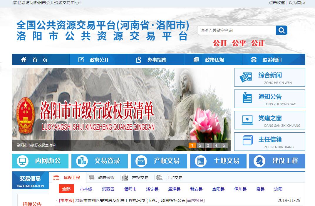 洛阳市公共资源交易中心是市政府直属正县级事业单位,编制60人,内设综合科、信息科、财务科、建设工程交易服务科、土地交易服务科、产权交易服务科、政府集中采购服务科、其他公共资源交易服务科等8个科室,2012年12月正式挂牌运行,是洛阳市公共资源交易活动的综合服务平台。洛阳市公共资源交易中心的招标投标及政府采购业务于2019年5月迁入洛阳市洛龙区开元大道与永泰街交叉口的洛阳市民之家。开标区位于6楼,设有7个开标室、4个询标室以及多功能厅、专家抽取室等;评标区位于7楼,设有10个评标室以及监控室等。设置有专家自动抽取系统、电子门禁系统、电子门牌系统、保证金管理系统、音视频电子监控系统、招投标电子化系统、政府采购电子化系统等。从区域上保证了开、评标区相对隔离,评标专家与投标人互不见面;从设计上保证了开标前网上投标报名和专家抽取的保密性;从流程上保证了全程网上办、全面自助办;实现了开标全公开、评标全封闭、监控全覆盖、全程电子化的工作目标。其主要职责是:负责为公共资源交易活动提供场所、设施和服务;承担工程建设项目招投标、土地使用权出让、国有产权交易、政府采购等公共资源交易项目的进场登记、场地安排、信息发布、保证金收退、专家抽取、交易活动保障、交易过程相关资料保存、交易数据统计与分析;协助相关职能部门调查处理公共资源交易中的质疑和投诉;建设、管理公共资源电子交易系统。