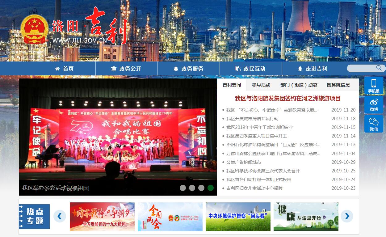吉利区是洛阳市“一中心六组团”的洛北组团,位于距洛阳市区30公里的黄河北岸,属洛阳市辖区之一。1978年因建设洛阳炼油厂(今中石化洛阳分公司)而设立,1982年正式建区。全区总面积80平方公里,辖4个街道,7个社区、29个行政村,城市建成区面积19.2平方公里;总人口近7万人,农业人口和城市人口大体上各占一半。吉利是一座历史悠久、文化灿烂的厚重之城。境内有距今四五千年的龙山文化遗址,有武王会盟台、河阳古战场、黄河古渡、万佛山石窟、泰山庙、营花寨等诸多文物古迹。商周八百诸侯会盟津、东汉公孙瓒大战河阳、西晋潘安掷果盈车和浇花息讼、唐代李光弼率旅讨逆,以及杜甫《石壕吏》中“急应河阳役,犹得备晨炊”和《新婚别》中“君行虽不远,守边戍河阳”等许多脍炙人口的故事,都发生于此。吉利是一座产业发达、特色明显的实力之城。吉利因石化而生,随石化而兴,建成了洛阳(国家)高新产业开发区吉利科技园,被确定为河南省石化产业集聚区。石化工业基础雄厚。拥有国家特大型企业——中石化洛阳分公司,拥有800万吨原油加工能力和32.5万吨PTA、20万吨聚酯、10万吨涤纶长丝、10万吨涤纶短纤维生产能力。产业集聚优势突出。汇聚工业企业105家,其中产业集群企业91家,占企业总数的80%以上;形成了以“石油化工、精细化工和化学新材料”三大产业为主导的工业发展格局,主导产业营业收入占集聚区全部营业收入的90%以上。 “十二五”期间,连续两年荣获“河南省十强产业集聚区”和“全省二星级产业集聚区”称号,2015年被评为“河南省新型工业化产业示范基地”。各类生产要素齐备。毗邻举世瞩目的黄河小浪底水库和西霞院水利枢纽工程,与义煤集团、晋煤集团等能源企业近在咫尺,水、电、煤、气等资源充足。区内拥有22万伏和11万伏变电站各一座,4X350MW天然气电厂一座,城市日供水能力10万吨。运输物流业车辆达到3.5万个吨位,整体规模全市领先。吉利是一座区位优越、交通便捷的现代之城。雄踞三市交界之处。吉利地处中原,承东启西、连南贯北,自古被称为“东西之腰脊,南北之咽喉”。位于洛阳、焦作、济源三座工业城市的交界之处,区位优势十分明显。以吉利为中心的30平方公里范围内,集中了总投资600亿元的洛阳大化纤工程、小浪底水利枢纽工程、西霞院工程等一大批国家重点工程。工程数量之多,投资密度之大,中西部地区绝无仅有。占尽陆空交通之利。焦枝铁路、二广高速、连霍高速、207国道、洛阳航空口岸或穿境而过,或近在咫尺,洛吉快速、洛济高速、焦—济—洛城际铁路连通在即,交通集散条件非常便利。坐拥洛阳桥头堡之势。吉利位于洛阳市最北端,是洛阳中心城区的重要组团,是洛阳向北发挥辐射带动作用的关键节点,更是河南省向西部、北部辐射陕西、山西的重要接力站和中转站,是一块极具发展潜力的投资沃土。吉利是一座依山傍水、风光秀美的宜居之城。南临滔滔黄河的湿地城市。城区与25平方公里的国家级黄河湿地保护区高度融合,与拥有35平方公里清澈水面的西霞院水库近在咫尺,碧波荡漾、沙滩鹭影,达到了湿地与城市、人类与自然的和谐统一,是观赏“高峡平湖、千岛卧波”黄河美景的最佳驿站。北依巍巍太行的森林城市。城区地势北丘陵、南滩区、中平原。北部岭区12平方公里的万佛山森林公园以及中部平原地带城市森林公园和生态森林防护带,使城市绿化覆盖率达到46%,被评为洛阳市创建国家森林城市先进区。广场绿地遍布的园林城市。在20平方公里的城市建成区内,自东向西排布着世纪广场、河阳广场、潘安公园、西霞院坝下公园等多个市民休闲娱乐场所,四季常青,景色怡人,人均公共绿地面积超过国家级园林城市标准,先后荣获河南省园林城区、河南省人居环境范例奖等多项荣誉称号。随着万亩黄河湿地休闲旅游园区和万佛山森林公园的开发建设,吉利区将叫响“洛阳后花园、中原大西湖”都市休闲旅游品牌,成为沿黄黄金旅游带上的崭新景区和中西部最佳人居场所。吉利是一座安居乐业、生活舒适的幸福之城。城乡发展均衡协调。近年来加快推进城乡规划布局、产业发展、基础设施建设、社会保障、社会管理等一体化,城镇化率达到67.6%,位居全省领先水平。各项事业蓬勃发展。社区文化、广场文化等各类群众性文化体育活动丰富多彩,中小学教育费用减免、新型农村合作医疗、新型农村养老保险、数字化电视推广、城乡低保提标扩面等多项民生工作位居省、市前列,先后荣获了全国文明城区、全国科技进步先进区、全国计生优质服务先进区、全国义务教育发展基本均衡区、河南省科普示范区等30余项国家和省、市级荣誉称号。社会管理和谐有序。持续推进社会管理与创新,多次被评为河南省平安建设先进区、全省社会治安综合治理先进区和全省信访工作先进区,群众安全感指数始终在省、市名列前茅。吉利是一座开放大气、潜力无限的希望之城。充满激情与活力。作为一座年轻的工业城市,吉利伴随改革开放的步伐一步步成长起来,外来人口占城市总人口的二分之一,人口的流动带来更多的思想创新、理念创新,技术创新。多年来,深入实施开放带动战略,凭借优越人文环境、开放的优惠政策,自身已打上深深的“文明开放的现代石化城”烙印,吸引着八方宾朋到此