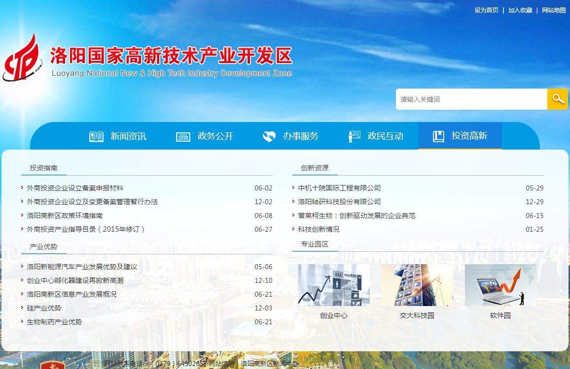 洛阳高新技术产业开发区,成立于1992年,是经国务院批准的53个国家级高新技术产业开发区之一,是洛阳第一家国家级高新技术产业区。开发区位于洛阳市区西南部,紧邻涧西大工业基地和智力密集区。园区实行一区多园管理模式,2000年以来,涧西区孙旗屯乡、洛龙区辛店镇被整建制委托高新区管理,吉利科技园和洛龙科技园被纳入高新区业务指导范围。目前洛阳高新区管辖面积达到96平方公里,总人口12万,2015年工业总产值实现1500亿元。目前高新区已经成长为洛阳高新技术产业的发展基地和自主创新的重要载体,也是洛阳经济快速发展的重要平台,也成为新时期洛阳经济发展的重要名片和平台。目前,洛阳高新技术产业开发区正在朝着新的高点迈进。结合洛阳的资源优势和产业特色,洛阳高新区确定了重点发展信息和文化设计产业、生物医药产业,扶持发展新材料产业、智能装备制造产业的2+2特色产业发展格局。装备制造产业。洛阳高新区成立后,经过二十余年的建设,目前已形成光电智能装备、工业自动化控制设备、有色金属加工成套设备、玻璃深加工成套设备、摩托车与汽车整车及生产设备、高端精密轴承、成套石化设备、高端特种专用装备8大产业集群。其中玻璃深加工成套设备领域代表企业--洛阳北玻公司的市场占有率处于世界同行业第一位,技术水平处于世界领先位置;有色金属加工设备代表企业—中色科技公司生产的有色金属加工装备占国内有色金属加工装备制造市场容量的50%以上,其中现代热轧机的市场占有率达到100%,技术水平处于国内领先位置。新材料产业。新材料产业是洛阳高新区重点发展的主导产业之一,经过多年的发展,形成了光伏及硅电子材料、钛材料、钨钼材料等3大产业集群。产业链方面形成了以高尔夫球头、人体植入物、阀门为代表的精铸钛制品;以冷凝器、热交换器、海水淡化设备为代表的钛设备;以多晶硅、单晶硅、电池片生产的硅电子材料产业链条;以钼靶材、丝材、超大钼板(片)、钼、钨异型合金制品、大型管状靶材为代表的钼钨合金材料产业链条;拥有洛阳双瑞精铸钛业有限公司、洛钼集团金属材料公司、洛阳单晶硅、洛阳尚德、洛阳四丰电子材料有限公司、洛阳金诺机械工程有限公司等一大批新材料产业企业。生物医药产业。高新区生物医药产业以普莱柯生物工程股份有限公司、娃哈哈恒枫饮料公司、洛阳巨尔乳业有限公司等为代表的兽用疫苗、生物制药、生物饮品产业集群。电子信息产业。洛阳高新区以洛阳中重自动化工程有限公司、凯迈(洛阳)电子有限公司、洛阳高新鸿业科技有限公司、洛阳源创电气有限公司、洛阳方智测控股份有限公司等为龙头企业的信息产业,在洛阳高新区已形成一个重要产业区域,竞争优势与规模效应已初步形成。建区十五年以来,洛阳高新区在发展高新技术产业方面取得了较好的成绩。引进了光机电一体化(先进制造技术设备、机电一体化机械设备和机械基础件)、新材料(金属材料、无机非金属材料和有机高分子材料及制品)、高效节能等主导高新技术产业,培育了一大批具有良好经济效益和社会效益的高新技术企业,涌现出众多具有自主知识产权的高新技术产品,在辐射带动区域经济发展方面发挥了重要作用,为促进洛阳成为国内领先的新型产业基地做出了突出的贡献。
