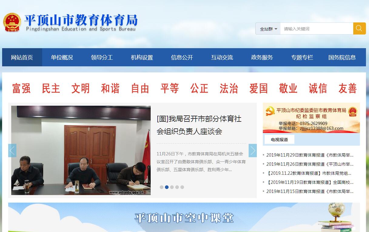 平顶山市教育体育局贯彻落实党中央关于教育体育工作方针政策和决策部署,在履行职责过程中坚持和加强党对教育体育工作的集中统一领导。其主要职责是:(一)贯彻落实党和国家教育体育方针政策和有关法律法规,起草有关教育体育的规范性文件并监督实施;负责教育体育理论研究和宣传工作。(二)研究提出在全市教育体育系统坚持党的领导、加强党的建设政策措施并组织实施;统筹全市教育体育工作的总体布局并负责协调推进和督促落实。(三)负责全市教育体育的统筹规划和协调管理;制订全市教育体育改革和教育体育事业发展规划;指导协调全市各级各类学校的教育教学改革;统筹规划全市竞技体育发展和体育运动项目设置和重点布局,指导全市体育场馆建设;负责体育经营活动管理,推动体育事业健康、有序、规范发展;负责全市教育体育基本信息的统计、分析和发布。(四)负责本部门教育体育经费的统筹管理,参与拟订教育体育经费筹措、拨款、基建投资的政策措施;负责统计全市教育体育经费投入情况和教育体育系统内部审计工作。(五)负责推进全市义务教育均衡发展和促进教育公平;负责义务教育的宏观指导与协调;指导普通高中教育、学前教育和特殊教育工作;落实基础教育教学基本要求,组织审定基础教育教学的地方性教材和补充教材,全面实施素质教育;指导全市教育督导工作,组织对中等及中等以下教育督导检查和评估验收工作;负责基础教育发展水平、质量的监测工作。(六)负责联系、协调、服务高等教育工作;指导以就业为导向的职业教育的发展与改革,落实中等职业教育专业目录、教学指导文件和教学评估标准;负责中等职业教育教材建设和职业指导工作。(七)负责全市教育体育系统思想政治、意识形态工作,指导各类学校的德育、体育、卫生、艺术教育、劳动教育与国防教育工作;指导全市教育体育系统落实好党的民族宗教政策;负责教育体育系统的安全稳定和信访工作。(八)主管全市教师工作。负责全市各级各类学校教师资格制度实施;负责全市教育系统的表彰奖励,归口管理教师和教育管理人员继续教育;配合有关部门研究提出各级各类学校编制标准,指导各级各类学校内部人事与分配制度改革;会同有关部门办理师范类院校毕业生就业报到工作;负责市运动队伍建设和体育后备人才培养,指导全市教育体育系统人才队伍建设。(九)会同有关部门制定全市中等及中等以下教育招生计划;指导中等职业学校毕业生开展就业创业工作。(十)组织举办全市综合性运动会,统筹规划全市青少年体育发展,指导和推进青少年体育工作。(十一)推行全民健身计划,指导并开展群众性体育活动,推动建立和完善全民健身公共服务体系。(十二)组织管理市内外重大体育竞赛的备战和参赛工作,组织开展体育运动中的反兴奋剂工作;承办一定规模赛事。(十三)拟订全市体育产业政策,推进全市体育产业发展。推动体育标准化建设;协助负责体育的管理工作。(十四)负责管理教育体育系统科研工作;组织和指导教育现代化工程;负责教育体育系统信息化建设。(十五)组织指导教育体育系统的对外交流与合作,开展汉语国际推广工作;开展与国外和港澳台的教育合作与交流;负责体育外事有关工作。(十六)落实国家语言文字工作的方针、政策,制定语言文字工作规划;负责普通话推广和普通话师资培训工作。(十七)承办市委、市政府交办的其他事项。