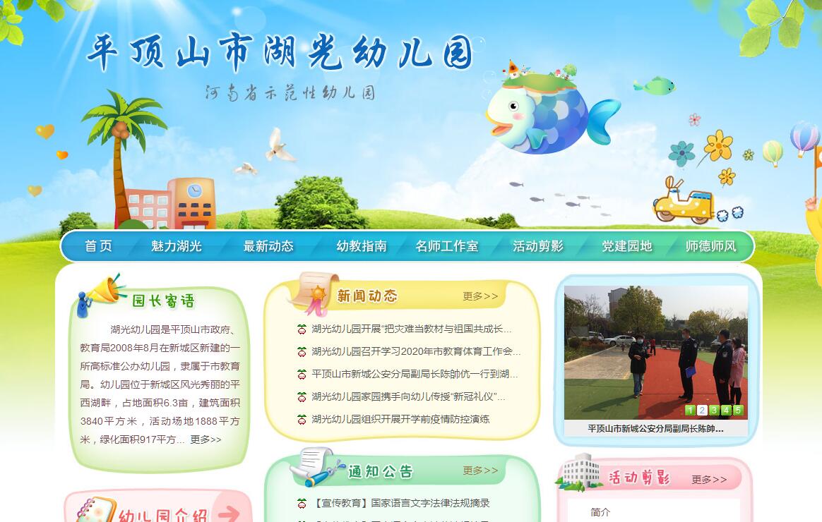 平顶山市湖光幼儿园是平顶山市政府、教育局2008年8月在新城区新建的一所高标准公办幼儿园,隶属于市教育局。幼儿园位于新城区风光秀丽的平西湖畔,占地面积6.3亩,建筑面积3840平方米,活动场地1888平方米,绿化面积917平方米,共有教职工78人,现有大中小15个教学班,600余名幼儿。硬件设施皆按照省级示范幼儿园标准配备。幼儿园管理规范,师资力量雄厚,拥有省级优秀教师1人,省级名师3人,省级骨干教师4人,省级“学术和技术带头人”3人,省级教育专家2人,市级“学术和技术带头人”1人,市级优秀教师5人,市级教育专家5人,市级骨干教师6人,中学高级教师3人,小学高级教师10人,教师学历达标率100%。自2008年开园以来,园领导班子以国家颁布的《幼儿园工作规程》、《幼儿园教育指导纲要》、《3-6岁儿童学习与发展指南》为指导思想,注重幼儿园的整体建设,提出了“以幼儿发展为本,做有思想的教师,办有文化的幼教,服务家长、服务社会”的办学理念。着力营造和谐向上的氛围,形成了“敬业奉献、理解关爱、平等和谐”的良好园风。幼儿园注重校园文化建设,重视环境教育。利用各种教育资源,开展形式多样的教育活动,形成了艺术创想、花样篮球为特色的园本课程,使幼儿得到全面、和谐、健康、富有个性的发展。幼儿园先后荣获河南省食品卫生“A级单位”、 “河南省文明单位”“河南省示范幼儿园”、“河南省卫生先进单位”“河南省先进家长学校”等殊荣。优美的环境,优质的服务,良好的教育以及一流的师资队伍,赢得了社会各界以及家长的一致好评,吸引了平顶山市、县、区各级幼儿园前来参观学习,成为鹰城幼教界的窗口。