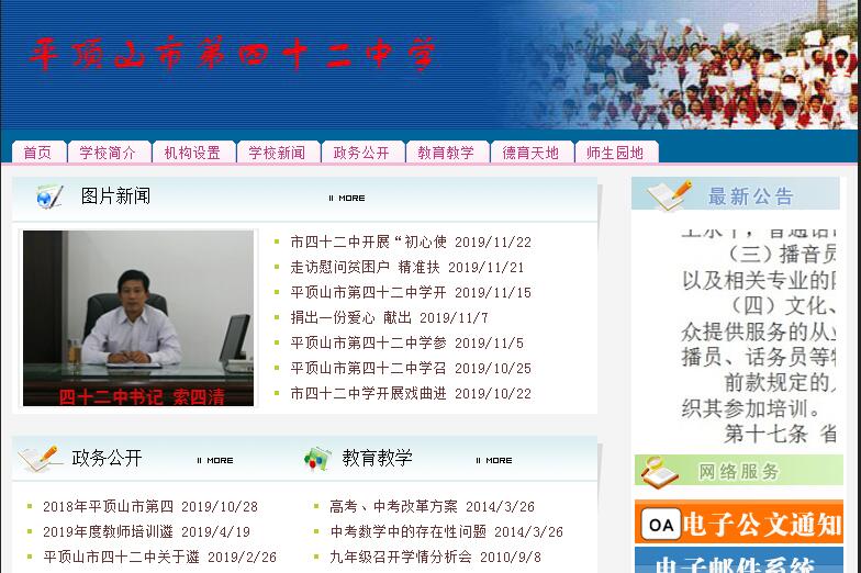 平顶山市第四十二中学是市教育局直属的全日制全封闭公办寄宿制学校,始建于1974年,人文底蕴深厚,是国家级绿色学校、省级文明学校、市首批示范性学校、市级文明单位、市级安全文明校园、市初中教学质量先进学校。学校位于平顶山市体育路北段,占地45亩,校园布局合理,绿树葱茏,鲜花馥郁,四季常青,是一座环境幽雅的花园式学校,是莘莘学子求学成长的理想场所。学校现有22个教学班,在校生1200多人,教职工116人,师资力量雄厚,有高级教师48人,一级教师41人,省部级优秀教师4人,国家级骨干教师2人,省市级骨干教师12人,省市级优质课教师35人。教学设施先进,每个班都配备了最先进的多媒体教学设备和有线电视。现代化的理、化、生实验室和微机室配置规范;全市最先进的学生公寓宽敞舒适;舞蹈教室、美术教室、音乐教室设施先进;现代化的运动场地整饰一新;图书室、阅览室藏书4万余册。平顶山市四十二中全面贯彻党的教育方针,积极实施素质教育。以“追求卓越,脚踏实地”为学校精神,以“良知、责任、荣誉、梦想”为校训,以“以人主动全面发展为本,面向世界面向未来育人”为办学理念,以“狠抓良好习惯养成,让每个学生都成人;积极实施爱的教育,让每个学生都成才”为育人理念,以“民主科学,严格高效”为管理理念,着力打造“主动高效,乐学善学”的学风、“敬业爱生,乐学善教”的教风和“文明守纪,团结进取”的校风,对学生进行四会五有(学会做人、学会求知、学会处事、学会生活;有健全的人格、有健康的身心、有渊博的知识、有自己的特长、有较强的能力)教育,使每个学生都能得到全面发展,学有所长。学校坚持“一个围绕、两个坚持、三个发展和四个目标”的办学思路。紧紧围绕“做学生喜欢的老师,办社会满意的学校”这一中心;坚持遵循教育教学规律,坚持遵循学生的身心发展规律和认知规律;注重教师的发展,注重学生的发展,注重学校的发展;力求学校成名,教师成家,学生成才,让学校成为师生快乐健康成长的家园。进一步深化教学改革,不断探索先进的教学模式,全力实施“五四三”教学管理模式和“四环节”课堂教学模式,努力打造限时高效素质课堂,教育教学质量不断提高。积极开辟第二课堂,开展丰富多彩的校园文化活动。加强班级文化建设,开展班班有歌声活动和传统文化进校园、进班级活动;开辟第二课堂,成立了写作班、英语口语班、奥数班、主持班、美术班、电脑班、合唱队、声乐队、篮球队、长跑队、乒乓球队等社团和兴趣班,促使学生全面发展,学有所长。忆往昔,荜路蓝缕,风雨沧桑话辉煌;看今朝,桃李不言,与时俱进谱新章;展未来,挥首激昂,开拓进取创伟业。如今,四十二中人在以杜均珩为首的校领导班子的带领下正高瞻远瞩,展开腾飞的双翼,乘风破浪,谱写着更加恢宏壮丽的新篇章。