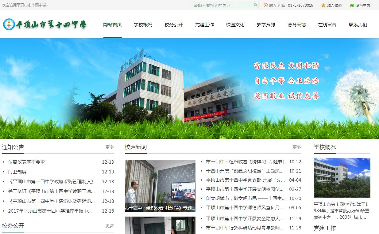 平顶山市第十四中学始建于1984年,是市首批办好50所重点初中之一,2005年被市教育局确定为“市级示范性学校”。学校占地面积16333平方米,建筑面积12616平方米。校本部现有27个教学班,在校生1600余人。教职工136人,其中高级教师56人,国家级劳模1人,特级教师2人,省级名师2人,省级学科带头人、骨干教师20人,省级中小学教育专家2人,省级(教育)专业技术人才1人;市五一劳模1人,市首届名校长1人、市级名师5人;市级以上优质课教师59人。学校教学设施一流,有高标准的实验室、图书室、阅览室,每个教室安装有多媒体教学系统,学校拥有高标准的运动场地,修建了塑胶篮球场。学校为每个教室安装了多媒体教学系统,为每个任课教 师配备了笔记本电脑,教学设施全市一流。建校以来,学校全面贯彻党的教育方针,全面推进素质教育,一心一意抓教学,理直气壮抓质量,及时总结办学经验,形成了切合学校实际、行之有效的管理办法,取得了优异成绩,学校每年升入省市示范高中的人数及教育局的综合评估始终居市直中学前列。学校先后获得了曾先后获得全国学习方法研究与推广先进学校、国家体育达标先进集体、国家级环保绿色学校、省园林单位、省德育工作先进集体、省教书育人楷模先进学校、省卫生工作先进学校、省现代教育技术实验学校、河南省教师发展学校试点单位、省青少年科 技教育示范学校、省文明学校、省文明单位、市优质课先进单位、市示范性学校、市直普通中学综合评估先进单位等多项荣誉。全面提高教育教学质量,创建和谐校园文化,打造鹰城精品名校,面对新的形势,学校提出新的奋斗目标,我们相信:十四中的明天更美好!