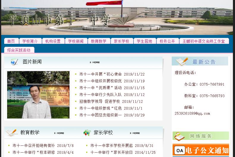 平顶山市第十一中学始建于1973年,2006年7月正式移交给平顶山市人民政府,是市教育局直属学校中一所九年义务教育学校。2017年被授予河南省文明单位。学校现有18个教学班,在校学生1240名。教学设施齐全,拥有阶梯教室、电子图书阅览室、计算机教室、音乐教室、舞蹈教室、录播教室、陶艺室、心理咨询室、理化生及科学实验室等,塑胶篮球场、器械场、足球场等体育设施完善。学校现有教职工89人,其中特级教师1人,高级教师21人,省教育厅学术技术带头人3人,省教育厅优秀教育管理人才2人,省教师教育专家1人,省五一劳动奖章获得者和省教学标兵6人,省市级骨干教师、市级拔尖人才、省市级名师名班主任、省市级优质课教师共计67人次,设有王鹏初中语文名师工作室。2017年辛桂莲老师被推荐为第十三届全国人大代表候选人,李丁炎老师获得省五一劳动奖章,许鸿浩老师被授予平顶山市最美教师称号。学校坚持传承与发展、质量加特色的办学思路,提出学校内涵发展、特色提升的“实施生态教育,打造特色名校”总体目标,致力于 “书香校园、诗情校园、生态校园”建设。2017年中招考试中,学校被评为平顶山市初中教学质量先进学校和教学质量进步学校;数学、英语、物理、化学、历史5个学科组被评为先进学科组;体育、理化生实验被评为特色先进学科;许鸿浩等11名教师被评为先进个人。 全面推进雅趣课,创客教育、机器人项目和3D打印等科技创新实践活动项目硕果累累,有力推动我校特色教育。组织参加全国奥林匹克头脑风暴(OM)比赛获得全国二等奖,“环球自然日”全球总决赛中获一等奖、三等奖各一项,在第18届全国中小学电脑制作活动中获得创客项目全国一等奖、三等奖各一项。学校被授予“环球自然日”河南省总决赛优秀组织单位。近年来,学校先后获得全国新教育实验示范校、全国中小学足球特色实验校、河南省文明标兵学校、河南省卫生先进单位、河南省综合实践课程建设样本学校等荣誉。2017年,学校先后被授予河南省科技活动特色学校、河南省一校一品足球特色学校、河南省创客教育试点学校、河南省知识产权教育实验学校、全国好教师基地校(河南)、全国新教育实验年会家校共育行动叙事特等奖、平顶山市青少年科技创新大赛先进单位、“十二五”期间平顶山市公共机构节能先进单位、平顶山市优秀少先队集体、平顶山市2017年中小学体育艺术“一校一品”示范校等荣誉。目前,学校向省市级名校迈进。