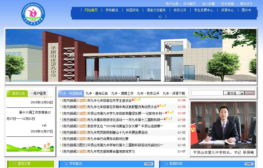 平顶山市第九中学建校于一九七三年。学校座落在人口稠密、交通便利、经济文化发达的中心区,南滨秀美的湛江,有风景如画的河滨公园和全市最大的青少年活动中心青少年宫,北有市工人文化宫,环境优雅。建校之初,学校是一所全日制完全中学,八十年代初改为初级中学。学校占地面积24236平方米,建筑面积12700平方米。现有24个教学班,教职工111人,其中高级教师58名、一级教师30名,省级骨干教师7名,省级学科带头人5名,是一支老中青相结合的优秀教师队伍。有设施一流、功能完备的物理、化学、生物实验室3个,计算机教室1个,多媒体专用教室3个,计算机146台,图书室藏书三万余册,阅览室订有门类齐全的报刊杂志,另有形体训练室、艺术室、德育活动室、大型阶梯教室等。体育设施先进,功能完备,有标准跑道、足球场各1个,篮球场4个,齐全的体操运动场地和器材等。学校规划合理、布局规范,形态各民的大小花坛草坪中,遍植各种名贵、实用的花草数十种,春有花,夏有荫,秋有果,冬有青,四季如画,环境优美,是师生工作学习的理想园地。学校坚持正确的办学方向,建设高素质的教师队伍,不断完善办学条件。学校领导班子构成年龄在40岁左右,全部具备大专以上学历,具有较强的工作、业务能力与管理水平。班子团结拼搏、开拓进取,与时俱进,努力创建办学特色,在学校管理上大胆引进竞争机制,完善激励制度。培养了一批教学骨干,推动了课堂教学结构的改革,提高了师生素质,全面推进了素质教育的实施,教学质量稳步提高,常年保持较好的升学率。现在,学校已形成了“严谨、勤奋、求实、创新”的优良校风。近十年来,先后荣获“全国高等教育自学考试工作先进单位”、“省级环境教育先进单位”、“省级体育卫生工作先进单位”、“省级全民健身先进单位”、“省级体育达标先进单位”、“市级教育质量先进单位”、“市级优质课先进单位”和“市级综合治理先进单位”和“市级绿色学校”等多个省、市级荣誉。 我们有信心向社会承诺,将始终按照国家教育法、教师法以及未成年保护法认真做好各项教育教学工作,把学生培养成德、智、体、美、劳全面发展的合格人才。