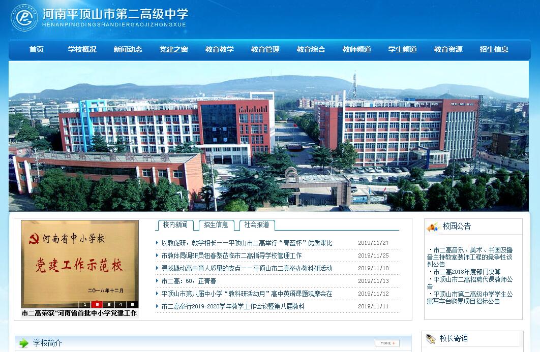 平顶山市第二高级中学,是市教育局直属的示范性普通高中。始建于1959年,原名为平顶山矿务局七矿职工子弟学校。1979年更名为平顶山矿务局第七中学,1996年更名为平煤集团第二高级中学(简称平煤二高)。2005年8月移交市教育局,正式更名为平顶山市第二高级中学。学校位于平安大道与矿工路西段交汇处,占地约35000平方米,现有30个教学班,学生1800余名。建校50多年来,市二高形成了鲜明的办学特色,创造了享誉百里矿区的办学质量,培养了数万名优秀毕业生。特别是移交市政府管理后,学校迎来了广阔的发展机遇。特别是移交市政府管理后,学校迎来了广阔的发展机遇。2006年,学校被评为市级示范性高中。2012年12月,被省委、省政府联合下文正式命名为“省级文明单位”。近年来,学校上下一心,以“两个狠抓保质量提升、三项工程促学校发展”为工作目标,不断开拓创新,取得了瞩目的成绩,学校先后荣获“普通高中教学质量先进单位”“基础教育先进集体”“普通高中特色办学先进学校”“文明标兵学校”等荣誉称号。 目前,市二高以鲜明的办学风格,先进的教育理念,优良的学风校风,浓厚的校园文化氛围在鹰城教育界独树一帜。学校背靠苍翠欲滴的落凫山,校园建筑肃穆典雅,教学区、活动区、生活区错落有致,布局合理,区域间苍松翠柏,繁华碧草,绿草茵茵。校园内环境幽静,文化氛围浓厚,随处可见名句警言,充满着浓郁的现代文化气息和厚重的育人弘学底蕴,为学生提供了良好舒适的学习环境。教学设施齐全,先后建有先进的学生微机室、多媒体教室、美术室、音乐室、舞蹈室等多功能特长专用教室,装备了先进的校园多媒体系统、闭路电视系统、广播听力系统、地面卫星接收系统,更新装备了高标准实验室、图书馆,建有高标准的学生公寓楼、标准化的学生运动场、宽敞洁净的学生餐厅,洁净环保的太阳能茶炉,是莘莘学子求学成长的好去处。50多年的历史积淀,使学校拥有了一大批经验丰富、学识渊博、师德高尚、理念超前、素质优良的教师队伍。学校现有教职工148名,其中特级教师1人,国家级骨干教师2人,河南省学术技术带头人5人,市级骨干教师13人,高级教师44人,市级以上优秀辅导教师68人。现任教师中一半以上有研究生教育经历,他们育人理念先进,科研创新能力强,学校每学期都要开展“十大魅力教师”“十大课改标兵”“我心目中的好老师”评选活动,为学生提供优质的教学保障。学校长期坚持以“质量立校”“科研兴校”“特色强校”的办学思路,连续十年被评为“平顶山市特长教育先进学校”,多次获得“平顶山市高中教学质量先进学校”。是河南省“学校心理研究会常务理事单位”、教育部命名的“教育科研示范单位”、全国“学习策略研究试验基地校”、“全国教育科学规划普通高级中学特色学校研究专项课题项目校”。2015年高考,我校再获丰收。本科上线214人,本科上线率达44.4%,比2014年本科上线166人净增48人,增长9.2个百分点;比2013年本科上线87人净增127人,三年连上三个大台阶,赢得了社会各界的高度赞誉。在平顶山市人民政府组织召开的庆祝第31个教师节表彰大会上,平顶山市二高荣获“高考目标完成奖”“优胜学科奖”“特色教育奖”三个奖项,被平顶山市人民政府授予“2015年高考质量奖”奖牌,是全市所有高中唯一一所连续两年同时获得“高考质量” 奖和“特色学校”奖两个奖项的学校。我校是开展特长教育最早成就最突出的普通高中,在鹰城教育中独树一帜。是首届河南省“青少年科技教育示范学校”、郑州大学体育学院的“生源基地”、河南省模特艺术协会平顶山“特设基地”。与北京“星城”艺术培训中心联合办学,与中央音乐学院、中国美院、河南师范大学等省内外著名高校建有长期协作关系。多年来,特长专业过关率在全市普通高中名列前茅,使一大批学生进入中央美院、中国传媒学院、中国音乐学院、成都体育学院等知名高校深造。两年来,有近50名同学被重点高校录取,每届高考本科进线率均在95%以上。一大批中考成绩不理想的学生因特长获得升入重点大学深造的机会。学校注重科技创新教育,是首届河南省“青少年科技教育示范学校”,依托科技创新社团、科技创新兴趣小组,开设科技创新班,配备科技创新辅导教师,每周开设科技创新课程,提高学生科技创新能力。自2001年以来,在青少年科技创新大赛中,我校教师辅导学生获得国家级、省级荣誉20多项,先后有六名学生因此而被保送进入全国重点大学深造。在河南省第28届科技创新大赛上,获得省一等奖5项、二等奖12项、三等奖8项、优秀辅导员成果奖4人、优秀组织工作者1人。在长期的办学实践中,学校铸造了优良的学风、校风,做人教育闻名遐迩。学校以“自律、荣校、自强、报国”为校训,秉承“要成材,先成人”德育管理理念,提出了“教书从育人开始,成才从成人做起”的育人理念,开展系统化的入学前教育,每天坚持诵读《弟子规》活动、每周一次义务劳动,定期开展公益活动,实行全寄宿封闭式管理,在各个区域内实行“自我教育,自我管理”的学生自我发展模式,培养学生自律、自立、自强意识,为学生终身发展奠定良好的基础。学校重视学生综合素质的提升,以“尊重个性,发展特长” 为学生发展理念,定期开展心理讲座、演讲赛、学科竞