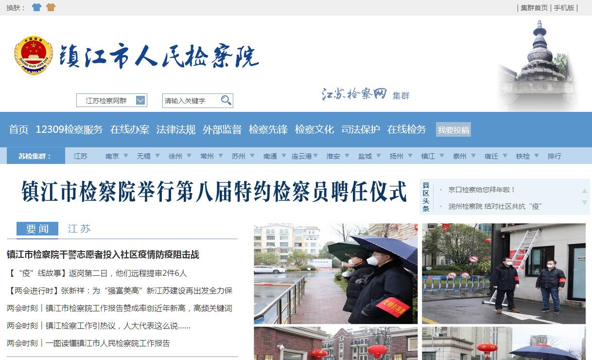 镇江市人民检察院位于镇江市东吴路133号,内设主要业务机构有:反贪局、渎职侵权侦查处、控告申诉处、公诉处、侦查监督处、民事行政检察处、监所检察处、检察技术处、预防处、研究室等。下辖丹阳市检察院、句容市检察院、扬中市检察院、京口区检察院、润州区检察院、丹徒区检察院、经济开发区检察院(市院派出院)、湾山地区检察院(市院派出院),全市检察干警501名。近年来,镇江市人民检察院在镇江市委和省检察院的领导,坚持以邓小平理论和“三个代表”重要思想为指导,强化法律监督,维护公平正义,求实,创新,团结,奋进,取得丰硕成果,被镇江市委、市政府评为“创一流环境、评满意机关”活动优胜单位、文明机关、人民满意的政法单位、社会治安综合治理先进单位、学习型机关先进集体等,所辖基层院全部被省检察院评为“五好检察院”,其中丹徒区检察院、丹阳市检察院、扬中市检察院被高检院或省委、省政府记集体一等功,句容市检察院、扬中市检察院被评为全省先进检察院,京口区检察院被授于国家级“优秀青少年维权岗”,润州区检察院、丹徒区检察院、丹阳市检察院、经济开发区检察院、湾山地区检察院被授于省级“优秀青少年维权岗”,经济开发区检察院被评为省级预防青少年犯罪工作先进集体。