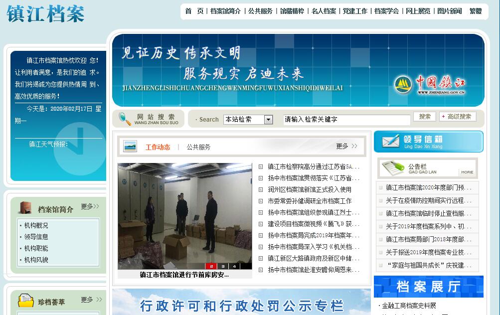 镇江市档案馆建立于1959年1月,1987年9月镇江市档案处更名为档案局,1997年局馆合并,为市委、市政府直属正处级事业单位,参照国家公务员制度管理。现内设办公室(挂“行政服务处”的牌子)、法规宣教处、业务指导处、保管利用处(挂“镇江市文件资料利用中心”的牌子)、征集编研处、信息技术处6个(科级建制)职能处室,下辖档案咨询服务中心。局(馆)核定全额拨款事业编制24名,现有工作人员25名,其中研究馆员4名、副研究馆员1名。镇江市档案馆于2011年6月晋升为国家一级综合档案馆,目前馆藏有清朝、民国和革命历史时期的珍贵档案,以及建国后机关、团体、事业单位档案20万卷、资料1.9万册。局(馆)不断加强信息化建设,推动档案管理现代化进程,现目录数字化200万余条,全文扫描223个全宗,55278卷,1034万余页。从手检到机检,提高了查全率和查准率。多年来,市委、市政府对档案工作给予了高度重视,分别于2003年、2006年、2012年先后三次召开全市档案工作表彰大会,表彰全市档案系统先进集体和先进个人,2006年以市委、市政府名义出台了《关于加强和改进档案工作的意见》。局(馆)先后三次被市委、市政府授予“镇江市文明机关”、 “文明城市创建活动先进单位”、“普法教育工作先进集体”、“国企改革三等功单位”等荣誉称号;全市档案宣传工作连续6年被江苏省档案局评为特等奖;局(馆)党支部连续5年被市级机关工委评为“先进党组织”,荣获“2013-2015年度先进基层党组织”、“四星”级法治型、服务型先进党支部;市档案学会荣获市学会科普工作先进奖、镇江市先进社科组织、2016年市档案馆被评为“镇江市社会科学普及示范基地”;2017年局(馆)荣获“2014—2016年度镇江市文明机关”称号。