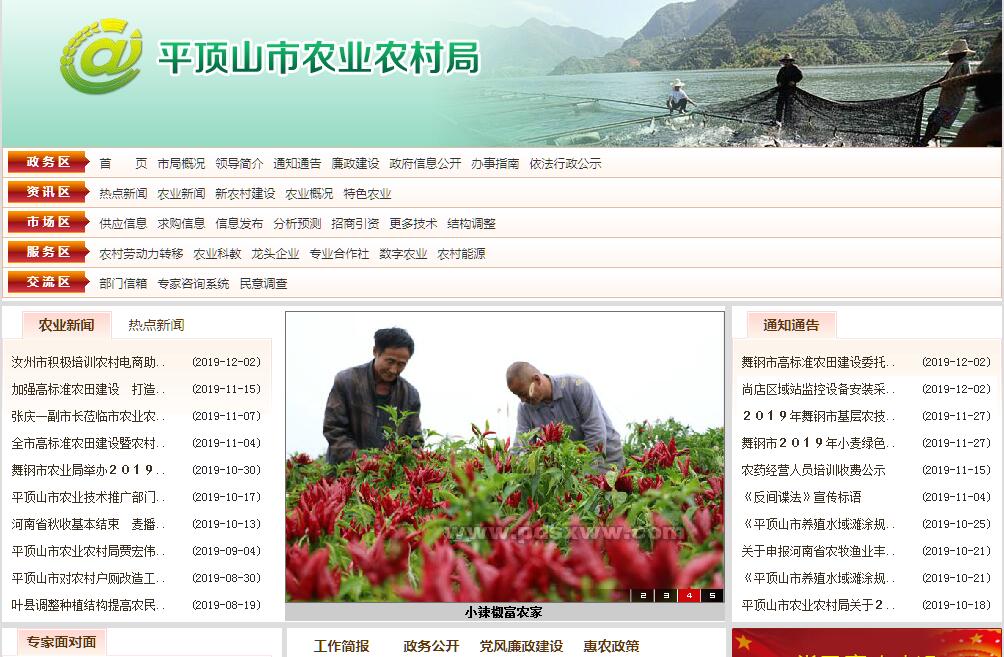 平顶山市农业农村局主要职责:(一)拟订全市种植业、渔业、乡镇企业、农垦及生态、休闲、品牌等现代农业有关产业(以下简称农业)和农村经济发展政策、发展战略、中长期发展规划并组织实施。拟订全市农业经济结构调整的政策、规划并组织实施。(二)承担完善全市农村经营管理体制责任。提出稳定和完善农村基本经营制度的政策建议并组织实施,指导农村土地承包、耕地使用权流转和承包纠纷仲裁管理。指导、监督减轻农民负担和村民筹资筹劳管理工作,监督惠农政策落实。指导农村集体资产和财务管理。指导、扶持农业社会化服务体系、农村合作经济组织、新型农业经营主体建设与发展。(三)指导全省粮食等主要农产品生产,组织落实促进粮食等主要农产品生产发展的相关政策措施,引导农业产业结构调整和产品品质改善;会同有关部门指导农业标准化、规模化生产。负责提出全市农业固定资产投资规模、方向和财政性资金安排意见,按市政府规定权限审批、核准市规划内和年度计划规模内固定资产投资项目。编报部门预算并组织执行,提出扶持农业农村发展的财政政策和项目建议,与市财政部门协商并共同组织实施。拟订农业开发规划并监督实施。配合市财政部门组织实施农业综合开发项目。(四)承担农业防灾减灾责任。监测、发布农业灾情,提出生产救灾资金安排建议,指导紧急救灾和灾后生产恢复。负责全市农作物重大病虫害防治。指导植物防疫和检疫体系建设。组织、监督对全市植物的防疫检疫工作,发布疫情并组织扑灭。组织植物检疫性有害生物普查。(五)促进农业产前、产中、产后一体化发展,拟订农业产业化经营发展规划与政策并组织实施。组织拟订促进农产品加工业发展政策、规划并组织实施。提出农业产业保护政策建议。指导农产品加工业结构调整、技术创新和服务体系建设。组织拟订农产品市场体系建设与发展规划。提出促进农产品流通的政策建议。(六)承担提升全市农产品质量安全水平责任。负责农产品质量安全监测,依法开展农产品质量安全风险评估,发布有关农产品质量安全状况信息。提出技术性贸易措施建议。参与制定农产品质量安全标准并会同有关部门组织实施。指导农业检验检测体系建设和机构考核。依法实施符合安全标准的农产品认证和监督管理。组织监督管理农产品质量安全。(七)组织、协调全市农业生产资料市场体系建设。依法实施对农作物种子(种苗)、农药的许可及监督管理。依法负责对渔船、渔机、网具的监督管理。负责对有关肥料的监督管理。(八)负责全市农业信息化体系建设,牵头拟订农业信息化发展规划、制度、规范。开展相关农业综合统计工作,发布农业和农村经济信息,指导农业信息服务工作;监测分析农业和农村经济运行情况,提出农产品市场调控的政策建议。开展培育农产品品牌工作。(九)拟订全市农业科技、教育、农技推广规划、计划和有关政策并组织实施。会同有关部门组织全市农业科技创新体系和现代农业产业技术体系建设,实施科教兴农战略,组织开展农业领域的高新技术和应用技术研究、农业科技成果转化和技术推广。负责农业科技成果管理,指导农技推广体系改革与建设。负责农业转基因生物安全监督管理。(十)会同有关部门拟订全省农业农村人才队伍建设规划并组织实施,指导农业教育和农业职业技能开发工作,参与实施农村实用人才培训工程。会同有关部门依法实施农业农村人才专业技术资格和从业资格管理。(十一)制定并实施全市农业生态建设规划,指导农村可再生能源综合开发与利用,指导农业生物质产业发展和农业农村节能减排,承担指导农业面源污染治理有关工作。划定农产品禁止生产区域,指导生态农业、都市农业、循环农业等发展。组织协调“菜篮子”工程建设。负责保护渔业水域生态环境。负责农业植物新品种和农业野生植物保护工作,牵头管理外来物种。(十二)组织全市农业资源区划工作,指导现代农业示范区建设。指导农用地、渔业水域、宜农滩涂、宜农湿地以及农业生物物种资源的保护和管理。拟订耕地及基本农田质量保护与改良政策并指导实施,依法管理耕地质量。运用工程设施、农艺、农机、生物等措施发展节水农业。会同有关部门处理渔事纠纷,行使渔船检验和渔政、渔港监督管理权。负责水生野生动植物保护工作。(十三)承担政府间农业涉外事务,参与农业贸易谈判工作,组织开展全市农业贸易促进和农业对外经济、技术交流合作。提出主要农产品的进出口建议,负责农产品出口基地建设工作并配合有关部门做好农产品出口工作。(十四) 承办市政府交办的其他事项。