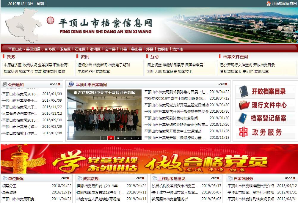 | 网站简介: 平顶山市档案局是市委、市政府管理全市档案事业的工作机构,根据授权,行使档案行政管理职能。其主要职责是:(一)贯彻执行党和国家、省关于档案工作的政策、法规,并负责监督、检查、实施。(二)对全市档案工作实行统筹规划和宏观管理,组织指导、监督、检查和协调全市各县(市)区、市直机关、群众团体、企业、事业单位的档案工作。(三)组织指导全市档案政策理论和档案学术研究工作;组织全市档案专业教育工作;负责全市档案干部的业务培训工作;负责全市档案专业技术职务的评聘工作。(四)负责全市档案的宣传工作;指导全市档案信息源的开发利用,向社会提供档案服务。(五)完成市委、市政府交办的其它工作。 |
