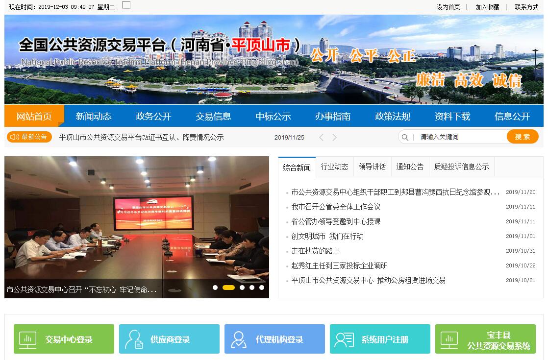 平顶山市公共资源交易中心成立于2012年4月,是直属市政府管理的正县级全供事业单位。交易中心位于市行政综合楼七楼,内设办公室、纪检监察室、建设工程交易科、土地矿产交易科、政府与医疗产品采购科、产权交易科、监督科、电子交易科、信息(人事)科等九个科室。正式编制65人。交易中心设置了报名受理处、交易活动区、开标区、评标区、办公区五个功能区域,面积4000㎡。交易活动区设有4个多媒体开标室、1个询标室,同时设有服务台、电子公示屏和专家休息区等设施;评标区设有6个封闭评标室,配套设施有储物柜、活动室、就餐室等服务设施,为评标人员提供优质服务。办公区设有四大类交易科室、监控室、专家抽取室等。中心还配置了完善的管理和服务系统,为各类交易提供服务,配套设施主要有用于交易类程序化、信息化办公软件系统,用于信息统一发布收集交流的综合性中心网站系统,用于各类交易信息发布的4块电子显示屏系统,用于交易实时监控的声像、视频闭路系统,用于询标的声询系统,用于交易的计算机网络系统,用于专家随机抽取的抽取和语音通知系统,用于移动电话的信号屏蔽系统,以及专家身份自动识别的门禁系统、会议音响系统等10多个系统,能满足各类公共资源的交易需要。