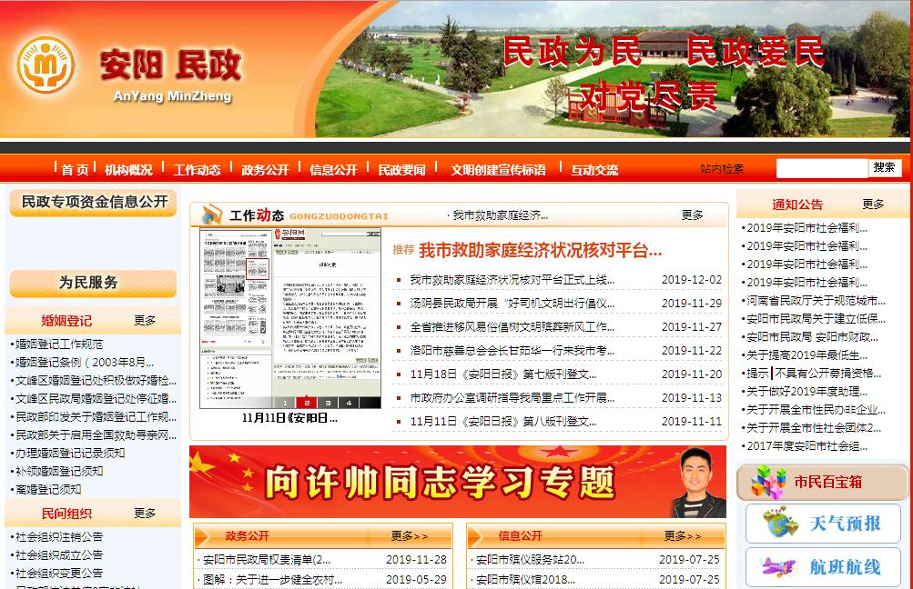 安阳市民政局贯彻落实党中央关于民政工作的方针政策和决策部署,在履行职责过程中坚持和加强党对民政工作的集中统一领导。其主要职责是:(一)贯彻民政工作法律、法规和方针政策,拟订全市民政事业发展规划和民政工作政策规定并组织实施。(二)负责依法对社会团体、社会服务机构等社会组织进行登记管理和执法监督。(三)拟订全市社会救助政策、标准,统筹社会救助体系建设,负责城乡居民最低生活保障、特困人员救助供养、临时救助、生活无着流浪乞讨人员救助工作。(四)拟订全市城乡基层群众自治建设和社区治理政策,指导城乡社区治理体系和治理能力建设,提出加强和改进城乡基层政权建设的建议,推动基层民主政治建设。(五)拟订全市行政区划管理政策和行政区域界限、地名管理办法并组织实施,承办乡镇以上行政区划设立、命名、变更和政府驻地迁移的审核报批工作,负责全市行政区域界线的勘定、管理和地名管理服务工作。(六)负责婚姻登记管理工作,推进婚俗改革。承担全市涉港、澳、台地区的婚姻登记工作。(七)拟订全市殡葬管理政策、服务规范并组织实施,推进殡葬改革。(八)统筹推进、督促指导、监督管理养老服务工作,拟订全市养老服务体系建设规划、政策、标准并组织实施,承担老年人福利和特殊困难老年人救助工作。(九)拟订全市残疾人权益保护政策,统筹推进残疾人福利制度建设和康复辅助器具产业发展。(十)拟订全市儿童福利、孤弃儿童保障、儿童收养、儿童救助保护政策、标准,健全农村留守儿童关爱服务体系和困境儿童保障制度。(十一)组织拟订全市促进慈善事业发展政策,指导社会捐助工作,负责福利管理工作。(十二)拟订全市社会工作、志愿服务政策和标准,会同有关部门推进社会工作人才队伍建设和志愿者队伍建设。(十三)完成市委、市政府交办的其他任务。