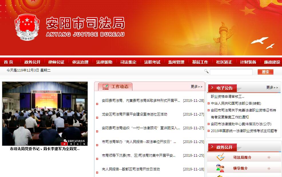 安阳市司法局主要职责:(一)承担全面依法治市重大问题政策研究,协调有关方面提出全面依法治市中长期规划建议,负责有关重大决策部署督察工作。(二)承担统筹规划立法工作责任。协调有关方面提出立法规划和年度立法工作计划建议。负责跟踪了解各部门对立法工作计划的落实情况,加强组织协调和督促指导,研究提出立法与改革决策相衔接的意见、措施。负责面向社会征集地方性法规、规章制定项目建议。(三)负责起草或者组织起草有关重要的、综合性的地方性法规、规章草案。负责对与群众利益密切相关的地方性法规、规章草案面向社会公众公开征求意见。审查报送市政府的地方性法规、规章草案,向市政府报告审查、修改意见。负责立法协调工作。(四)承担市政府规章向国务院、省人大常委会、省政府、本级人大常委会备案工作。承担各县(市、区)政府和市政府各部门规范性文件备案工作。负责市政府规章的立法解释、立法后评估工作。负责市政府规章清理、编纂工作,指导全市政府规章、规范性文件清理工作。(五)承担统筹推进法治政府建设责任。负责推进全市依法行政、建设法治政府方面的统筹规划、综合协调、督促指导、考核评价工作。指导监督市政府各部门、各县(市、区)政府依法行政工作。(六)负责综合协调、指导监督全市行政执法工作。研究完善规范行政执法有关制度,推进严格规范公正文明执法。负责推进服务型行政执法建设,全面落实行政执法责任制。承担推进行政执法体制改革有关工作。负责全市行政执法主体和行政执法人员资格管理。负责指导行政裁决工作。(七)承担市政府交办的法律事务。负责市政府涉法重大决策和重要事务合法性审查。负责推进全市法律顾问工作。(八)承担统筹规划法治社会建设责任。负责拟订全市法治宣传教育规划,组织实施普法宣传工作。推动人民参与和促进法治建设。指导全市依法治理和法治创建工作。指导全市人民调解、行政调解,行业性专业性调解工作和人民陪审员、人民监督员选任管理工作。推进司法所建设。(九)负责拟订全市公共法律服务体系建设规划并指导实施。统筹和布局全市城乡、区域性法律服务资源。指导监督全市律师、法律援助、司法鉴定、公证、仲裁和基层法律服务管理工作。(十)负责全市国家统一法律职业资格考试组织实施工作。负责全市统一法律职业资格和证书管理工作。负责规划和指导全市法律职业人员入职前培训工作。(十一)管理市监狱工作。管理和监督市监狱刑罚执行、改造罪犯等工作。指导管理全市社区矫正工作,指导社会力量和志愿者参与社区矫正工作。指导刑满释放人员安置帮教工作。(十二)管理市强制隔离戒毒工作。指导监督市强制隔离戒毒措施执行和戒毒康复工作。对社区戒毒和社区康复工作提供指导、支持和协助。(十三)指导监督全市司法行政系统财务、装备、设施、场所建设等保障工作。指导监督所属单位的内部审计工作。负责全市司法行政系统警务装备的管理工作。(十四)指导监督全市司法行政系统的队伍建设。负责全市司法行政系统警务管理和警务督察工作。协助县(市、区)管理司法局领导干部。(十五)完成市委、市政府交办的其他任务。
