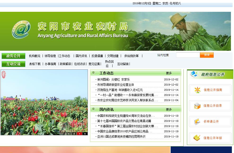 安阳市农业农村局是市政府工作部门,为正处级。中共安阳市委农村工作领导小组办公室设在市农业农村局。市农业农村局贯彻落实党中央关于“三农”工作的方针政策和决策部署,在履行职责过程中坚持和加强党对“三农”工作的集中统一领导。其主要职责是:(一)统筹研究和组织实施全市“三农”工作的发展规划、政策,组织起草农业农村有关规范性文件,指导农业综合执法。参与涉农的金融保险等政策制定。(二)统筹推动全市发展农村社会事业、农村公共服务、 农村文化、农村基础设施和乡村治理。牵头组织改善农村人居环境。指导农村精神文明和优秀农耕文化建设。指导农业行业安全生产工作。(三)拟订全市深化农村经济体制改革和巩固完善农村基本经营制度的政策。负责农民承包地、农村宅基地改革和管理有关工作。负责农村集体产权制度改革,指导农村集体经济组织发展和集体资产管理工作。指导农民合作经济组织、农业社会化服务体系、新型农业经营主体建设与发展。(四)指导开展乡村特色产业、农产品加工业、休闲农业、乡镇企业、农业产业化等工作。提出促进农产品流通的建议,培育、保护农业品牌。发布农业农村经济信息,监测分析农业农村经济运行。承担农业统计和农业农村信息化有关工作。(五)负责全市种植业、畜牧业、渔业、农垦、农业机械化等农业各产业的监督管理。指导粮食等农产品生产。组织构建现代农业产业体系、生产体系、经营体系,指导农业标准化生产。负责渔业管理和渔政监督管理。(六)负责全市农产品质量安全监督管理。组织开展农产品质量安全监测、追溯、风险评估。参与制定农产品质量安全标准并会同有关部门组织实施。指导农业检验检测体系建设。(七)组织全市农业资源区划工作。指导农用地、渔业水域以及农业生物物种资源的保护与管理。组织水生野生动植物保护、耕地及永久基本农田质量保护和高标准农田建设工作。(八)指导全市农产品产地环境管理和农业清洁生产。指导设施农业、生态循环农业、节水农业发展以及农村可再生能源综合开发利用、农业生物质产业发展。承担外来物种管理相关工作。(九)负责全市有关农业生产资料和农业投入品的监督管理。组织农业生产资料市场体系建设,依据国家有关农业生产资料、兽药质量、兽药残留限量和残留检测方法标准实施监督。组织兽医医政、兽药药政药检工作,负责执业兽医和畜禽屠宰行业管理。(十)负责全市农业防灾减灾、农作物重大病虫害防治工作。指导动植物防疫检疫体系建设,组织、监督动植物防疫检疫工作,发布疫情并组织扑灭。(十一)负责全市农业投资管理。拟订农业投资项目建设规划,提出农业投资规模和方向、扶持农业农村发展财政项目的建议,按规定权限审批农业投资项目,负责农业投资项目资金安排和监督管理。(十二)推动全市农业科技体制改革和农业科技创新体系建设。指导农业产业技术体系和农技推广体系建设,组织开展农业领域的高新技术和应用技术研究、科技成果转化和技术推广。负责农业转基因生物安全监督管理和农业植物新品种保护。(十三)指导全市农业农村人才工作。拟订农业农村人才队伍建设规划并组织实施,指导农业教育和农业职业技能开发,指导新型职业农民培育、农业科技人才培养和农村实用人才培训工作。(十四)牵头开展全市农业对外合作工作。承办政府间农业涉外事务,组织开展农业贸易促进和有关国际交流合作,参与农业贸易谈判工作。提出主要农产品的出口建议,负责农产品出口基地建设并配合有关部门做好农产品出口工作。(十五)完成市委、市政府和中共安阳市委农村工作领导小组交办的其他任务。