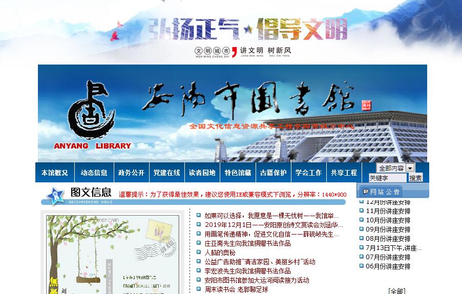 安阳市图书馆始建于1956年5月,几经迁移,于2008年12月25日正式对外开放。新馆建筑面积16000平方米,各类型藏书40多万册(件),拥有高、中、初级在职职工43人,内设采编部、图书部、报刊部、网络技术部、电子文献部、历史文献部、信息部、研究辅导部、办公室、财务部10个部门。新馆设有现代化的报告厅、多功能厅、展览厅、社会教育中心、多媒体阅览室、视听室、各类型书库、阅览室和读者自修室,可向读者提供馆藏图书、报刊文献借阅、信息咨询、定题服务、社会教育培训、图书馆学教育与业务辅导、展览、网络文献信息、视听资料查询、古籍和地方文献检索、文化休闲娱乐等服务。新馆内外环境洁净优美,图书馆建筑设计既突出了古都安阳殷商文化的特点又渗透了现代安阳文明的特征,是全国优秀文化精品建筑和安阳的文化标志性建筑。馆内智能化、网络化的先进设施和丰富的数字资源,为实现图书馆数字化、网络化服务提供了良好的条件。新馆将以实现卓越的知识服务为工作目标,牢固树立“以人为本”的服务理念,认真落实科学发展观,不断开拓创新,以实现我市图书馆事业的新跨越、新发展。我们将通过不懈的努力,力争把新馆建成我市的文献信息收藏、传递中心,社会教育中心,文化休闲娱乐中心,图书馆服务网络中心。使之为古都安阳的历史文化传承和现代文明发展做出应有的贡献。