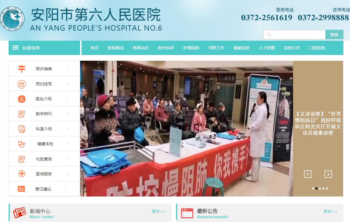 安阳市第六人民医院是一所集预防、医疗、保健、急救、科研、教学为一体的现代化大型三级医院,目前,由一所综合医院和两所口腔医院组成。是国际“微笑列车”A级定点医院、北京大学口腔医院合作医院、四川大学华西口腔医学院合作医院、河南省儿童医院医联体成员单位、河南护理职业学院教学医院、新乡医学院教学医院。医院建筑面积9.2万平方米,现开放病床1600张,职工1300余人,卫计人员占职工总数的83.8%,其中高级职称人员80人。拥有开源CT、3.0T超导核磁、128层螺旋CT、1.5T超导核磁、口腔专用CT、高端四维彩超、全自动生化免疫流水线、C型臂数字血管造影机、大型高压氧舱等一批顶尖诊疗设备。医院设有临床医技科室65个,市级重点专科2个(口腔种植科、三叉神经痛科),院级优势专科5个(神经内科、心血管内科、耳鼻喉科、妇产科、口腔科),重点建设了泌尿外科、脑外科、微创骨科、疼痛科、腔镜外科、重症医学科。成立了安阳市碎石治疗中心、安阳市高血压防治中心、安阳市糖尿病防治中心。相继开展了脑栓塞超早期溶栓治疗术、心肌梗塞急诊支架治疗术、人工关节置换术、椎间孔镜手术微创治疗椎间盘突出、钬激光碎石取石术、微创射频治疗三叉神经痛等特色技术。每年发表SCI、省级、国家级、核心期刊医学论文百余篇。近年来,医院致力于建设优质服务医院、数字化医院,率先实行“一卡通”就医模式,成立网络医院,多角度、高层次地满足患者的就诊需求,树立了医院服务品牌。今后,医院将继续秉承“精诚行医,敬业奉献”的精神,坚持“一切为了人民健康”的宗旨,以精准的医疗技术、良好的医德医风、精细化的管理手段,为广大患者提供优质、高效、便捷的医疗保健服务。