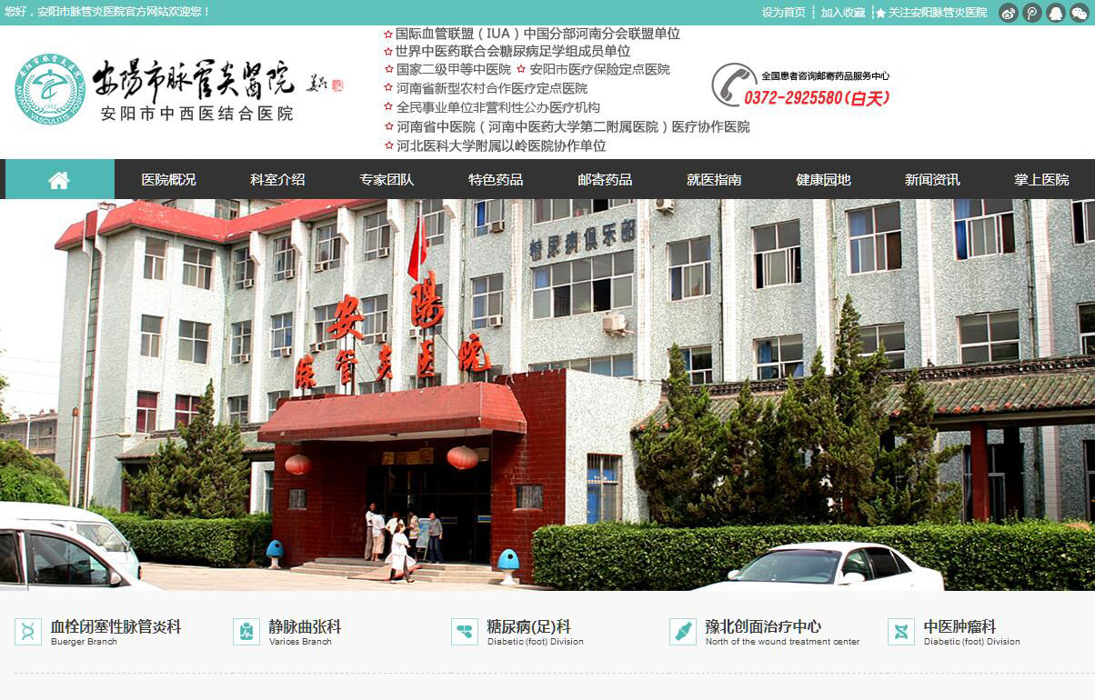安阳市脉管炎医院,二级甲等中医院,是由政府举办的公立医疗机构。医院始建于1984年6月,是一所集医疗、康复、预防、科研为一体的全民事业单位,也是安阳市医疗保险定点医院、河南省新型农村合作医疗定点医院。医院占地20余亩,建筑面积9000平方米,床位150张,设有临床、医技、行管科室20多个,现有职工近161人,副高以上职称21人,其中正高5人,专业技术人员94人。年均门诊2万人/次、住院人数1500人/次、病床使用率96.3%。我院技术力量雄厚,办院独具特色,在国内外享有良好声誉。其中,我院"周围血管病科"被河南省中医管理局授予河南省重点中医专科。医院拥有万元以上医疗设备35台(件),配有彩超、血管多普勒超声诊断仪、DR(医用X射线摄影系统新东方1000B)、移动式C型臂X射线机(HHMC——160)、数字胃肠机(医用诊断X射线机HF52-2)、十二导全自动心电图机、静脉曲张腔内激光治疗仪、全自动生化分析仪、动静脉血流图、血流变仪、胰岛功能检测等现代化诊疗设备,使辅助检查和疾病诊疗技术迈上了更高台阶。医院设有脉管炎专科、静脉炎科、静脉曲张科、动脉硬化闭塞症科、糖尿病(足)科、中医治未病、风湿骨病科、心脑血管病科、中医肿瘤等临床科室。其中“脉管炎、静脉炎、静脉曲张、动脉梗化闭塞症、糖尿病足”等科室为我院重点发展科室。医院竭诚为广大群众提供高水平、全方位、多层次的综合医疗、保健服务。