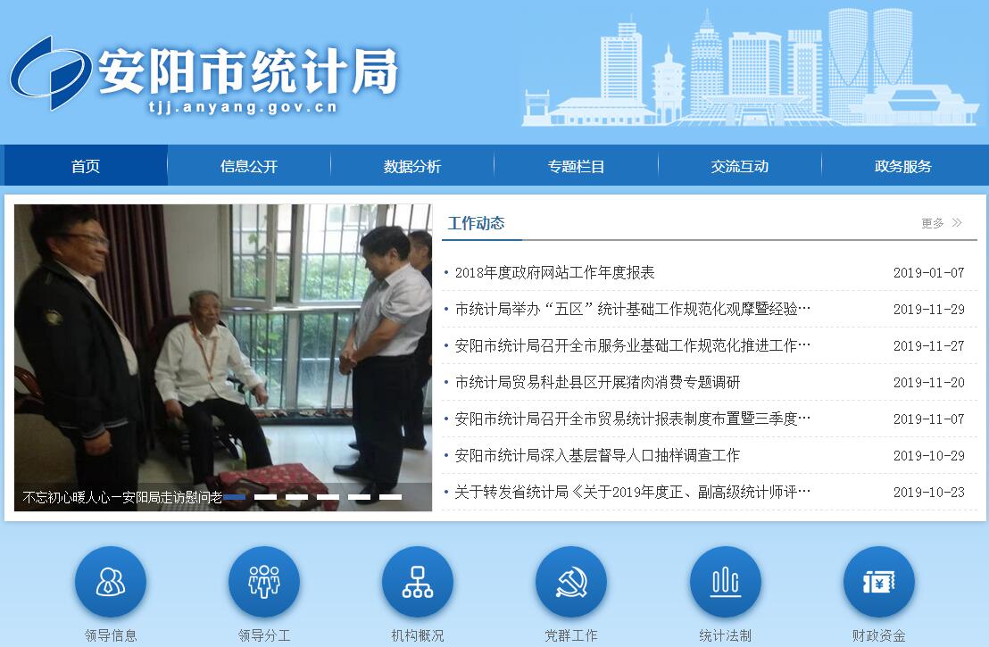 安阳市统计局主要职责:(一)组织领导和协调指导全市统计工作,确保统计数据真实准确、完整及时;贯彻执行国家、省统计政策、规划、基本统计制度和统计标准;贯彻执行国家、省统计法律、法规及规章,起草统计方面规范性文件草案,制定部门规范性文件;负责基本单位名录库建设和维护管理。(二)组织实施对全市统计工作的监督检查,负责较大案件查处,组织协调全市执法工作,负责提出统计违纪违法责任人处分处理建议,承担法律法规赋予市级统计行政部门履行的其他执法职责,监督指导县(市、区)统计行政执法工作。(三)贯彻执行国家、省国民经济核算制度,建立健全全市国民经济核算体系和统计指标体系,配合国家、省统计局核算全市生产总值,组织核算各县(市、区)生产总值,监督管理各县(市、区)国民经济核算工作。(四)会同有关部门贯彻落实全国重大国情国力普查计划、方案,组织实施全市人口、经济、农业等国情国力普查和投入产出调查等大型专项调查,汇总、整理和提供有关国情国力方面的统计数据。(五)组织实施农林牧渔业、工业、建筑业、批发和零售业、住宿和餐饮业、房地产业、装卸搬运和仓储业、互联网和相关服务、软件和信息技术服务业、租赁和商务服务业、居民服务、修理和其他服务业、文化体育和娱乐业等统计调查,组织实施能源、投资、人口、劳动工资、科技、企业创新、文化产业、社会发展基本情况、环境基本状况等统计调查,收集、汇总、整理和提供有关调查的统计数据;综合整理和提供地质勘查、资源、房屋、对外贸易、对外经济、交通运输、邮政、信息传输、财政金融税收、旅游、教育、卫生、社会保障、公用事业等全市性基本统计数据。(六)组织实施规模以下工业抽样调查、规模以下工业企业成本费用调查、建筑业小微企业抽样调查、小微企业固定资产投资情况调查、规模以下企业创新调查、限额以下批发零售住宿餐饮行业抽样与问卷调查、规模以下服务业抽样调查,开展调查情况分析研究;组织实施重要统计监测评价考核和社情民意调查。(七)组织各县(市、区)、市政府各部门的经济、社会、科技和资源环境统计调查;统一核定、管理、公布全市性基本统计资料,定期发布全市国民经济和社会发展情况的统计信息。(八)对国民经济、社会发展、科技进步和资源环境等情况进行统计分析、统计预测和统计监督;向市委、市政府及有关部门提供统计信息和咨询建议。(九)制定全市统计调查计划,负责全市统计调查项目的管理;依法备案市级各部门统计调查项目、地方统计调查项目;指导专业统计基础工作、统计基层业务基础建设;组织建立全市服务业统计信息共享制度和发布制度;建立健全统计数据质量审核、监控和评估制度,开展对重要统计数据的审核、监控和评估;依法监督管理涉外调查活动。(十)协助各县(市、区)管理统计局局长;指导全市统计专业技术队伍建设;负责统计教育和培训,协助有关部门组织管理统计专业技术资格考试、职务评聘工作;监督管理各县(市、区)政府统计部门由中央、省、市财政提供的统计经费和专项基本建设投资。(十一)建立并管理全市统计信息自动化系统和统计数据库系统,组织制定各县(市、区)、市政府各部门统计数据库和网络的基本标准和运行规则;指导各县(市、区)统计信息自动化系统建设。(十二)完成市委、市政府交办的其他任务。