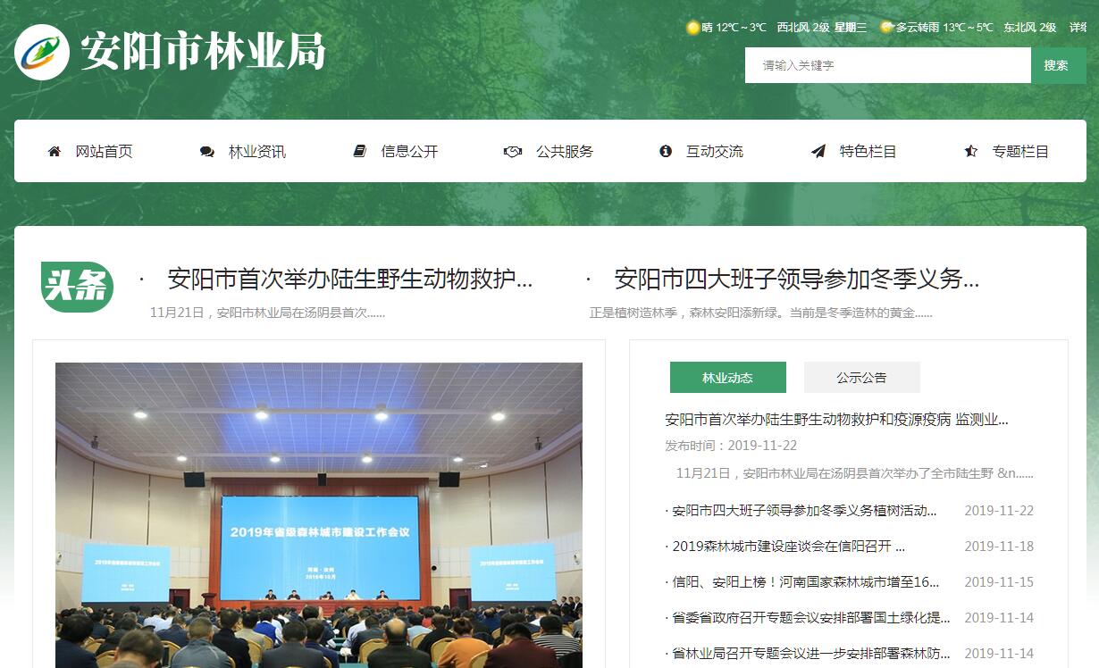 安阳市林业局主要职责:(一)负责林业和草原及其生态保护修复的监督管理。拟订林业和草原及其生态保护修复的政策、规划、标准并组织实施。负责林业和草原相关行政执法监管工作。组织开展森林、草原、湿地、荒漠和陆生野生动植物资源动态监测与评价。(二)组织林业和草原生态保护修复和造林绿化工作。组织实施林业和草原生态保护修复工程,指导公益林和商品林的培育,指导、监督全民义务植树、城乡绿化工作。指导林业和草原有害生物防治、检疫工作。承担林业和草原应对气候变化的相关工作。承担安阳市绿化委员会日常工作。(三)负责森林、草原、湿地资源的监督管理。组织编制并监督执行全市森林采伐限额。负责林地管理,拟订林地保护利用规划并组织实施。指导公益林划定和管理工作,管理国有森林资源。负责草原禁牧、草畜平衡和草原生态修复治理工作,监督管理草原的开发利用。负责湿地生态保护修复工作,拟订湿地保护规划和相关地方标准,监督管理湿地的开发利用。指导基层林业工作站的建设和管理。(四)负责监督管理荒漠化防治工作。组织开展荒漠化调查。组织拟订防沙治沙、石漠化防治建设规划,拟订相关地方标准,监督管理沙化土地的开发利用。(五)负责陆生野生动植物资源监督管理。组织开展陆生野生动植物资源调查,指导陆生野生动植物的救护繁育、栖息地恢复发展、疫源疫病监测,监督管理陆生野生动植物猎捕或采集、驯养繁殖或培植、经营利用,按分工监督管理野生动植物进出口。(六)负责监督管理各类自然保护地。拟订各类自然保护地规划和相关地方标准。根据授权,负责自然保护地的自然资源资产管理和国土空间用途管制。组织申报省级以上自然保护地,提出新建、调整各类市级自然保护地的审核建议并按程序报批。组织审核世界自然遗产的申报,会同有关部门审核世界自然和文化双重遗产的申报。负责生物多样性保护有关工作。(七)负责推进林业和草原改革相关工作。拟订集体林权制度、国有林场、草原等重大改革意见并监督实施。拟订农村林业发展、维护林业经营者合法权益的政策措施,指导农村林地承包经营工作。开展退耕(牧)还林还草,负责天然林保护工作。(八)拟订林业和草原资源优化配置及木材利用政策,拟订相关林业产业地方标准并监督实施,组织指导林产品质量监督。指导生态扶贫相关工作。(九)指导国有林场基本建设和发展,承担经济林、花卉管理工作。组织林木种子、草种种质资源普查,组织建立种质资源库,负责良种选育推广,管理林木种苗、草种生产经营行为,监管林木种苗、草种质量。监督管理林业和草原生物种质资源、转基因生物安全、植物新品种保护。(十)指导全市森林公安工作,监督管理森林公安队伍,指导全市林业重大违法案件查处,负责林业草原相关行政执法监管工作,指导林区社会治安治理工作。(十一)负责落实综合防灾减灾规划相关要求,组织编制森林和草原火灾防治规划和防护标准并指导实施,指导开展防火巡护、火源管理、防火设施建设等工作。组织指导国有林场和草原开展防火宣传教育、监督预警、督促检查等工作。必要时,可以提请应急管理部门,以市级应急指挥机构名义,部署相关防治工作。依法履行林业安全生产监督管理职责,指导全市国有林场的安全监督管理工作。负责林业系统安全生产统计分析,依法参加有关事故的调查处理。(十二)监督管理林业和草原中央、省级拨付我市的资金、市级资金及国有资产,提出林业和草原预算内投资、中央和省级、市级财政性资金安排建议;按规定权限审核中央、省级、市级规划内和年度计划内投资项目。组织实施林业和草原生态补偿工作。(十三)负责林业和草原科技、教育和外事工作,指导全市林业和草原人才队伍建设。组织实施林业和草原对外交流与合作事务,承担湿地、防治荒漠化、濒危野生动植物等国际公约履约工作。(十四)完成市委、市政府及安阳市自然资源和规划局交办的其他任务。