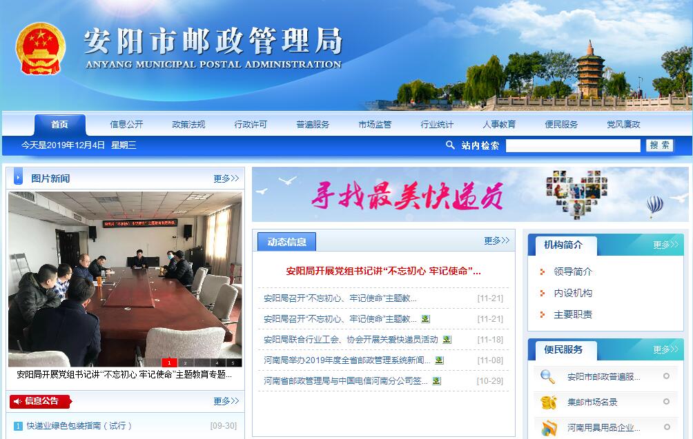 | 网站简介: 安阳市邮政管理局主要职责:一是贯彻执行国家法律法规规、方针政策和邮政服务标准;二是研究拟订本地区邮政发展规划;三是监督管理本地区邮政市场以及邮政普遍服务和机要通信等特殊服务的实施;四是负责行业安全生产监管统计等工作;五是保障邮政通信与信息安全;六是承办省邮政管理局及市人民政府交办的其他事项等等。 |