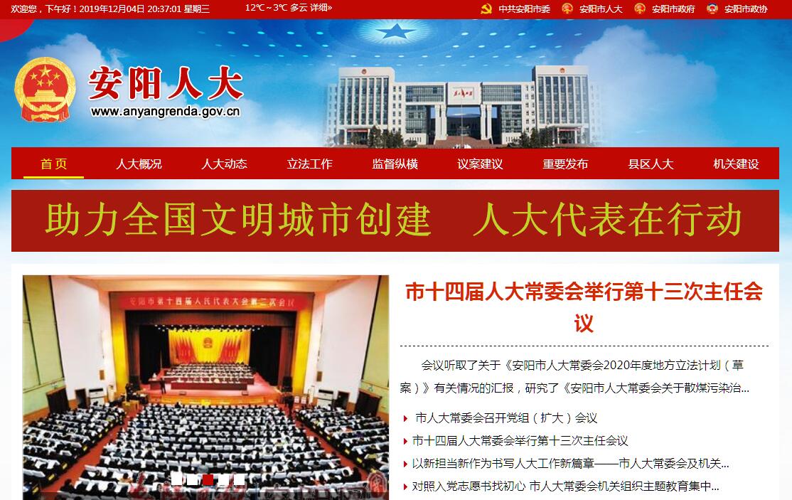 安阳市人民代表大会是我市的地方国家权力机关,由市属9个县(市)区人民代表大会和驻我市的人民解放军选举出的代表组成,每届任期五年。从1954年召开第一届人民代表大会开始,目前是第十四届人民代表大会,现有人大代表435人。市人大常委会是市人民代表大会的常设机关。新中国成立后较长一段时间,地方各级人民代表大会没有设立常务委员会,人民代表大会闭会期间,由本级人民委员会代行其职权。改革开放后,为了加强和推进社会主义民主与法制建设,1979年7月,五届全国人大二次会议通过的《中华人民共和国地方各级人民代表大会和地方各级人民政府组织法》规定,在县级以上地方各级人民代表大会设立常务委员会,作为本级人民代表大会的常设机关。根据这一规定,1981年11月召开的安阳市第六届人民代表大会第一次会议选举产生了安阳市人民代表大会常务委员会,简称安阳市人大常委会,对市人民代表大会负责并报告工作。市十四届人大常委会现有组成人员共39人,其构成是:主任1人,副主任5人,秘书长1人,委员32人;委员由包括各民主党派在内的各方面代表和群团组织的负责人担任。市十四届人大常委会设有工作机构12个:办公室、调查研究室、信访办公室、内务司法工作委员会、财政经济工作委员会、教科文卫工作委员会、城建环保工作委员会、选举任免代表工作委员会、农业与农村工作委员会、民族侨务外事工作委员会、预算工作委员会、和法制工作委员会。根据我国《宪法》和《地方组织法》的规定,市人大常委会具有的职权,概括起来有以下几个方面:讨论决定重大事项、监督同级“一府一委两院”的工作、任免国家机关工作人员等。随着我国改革开放事业和民主法制建设的不断发展,市人大常委会在市委的领导下,紧紧围绕经济建设这个中心,认真履行宪法和法律赋予的各项职权,积极开展地方立法工作,不断加大对“一府一委两院”的监督力度,与广大人大代表和人民群众保持密切联系,积极推进我市的物质文明建设、精神文明建设和民主法制建设,各项工作都取得了明显的成效,在我市的政治、经济和社会生活中发挥了重要的作用。