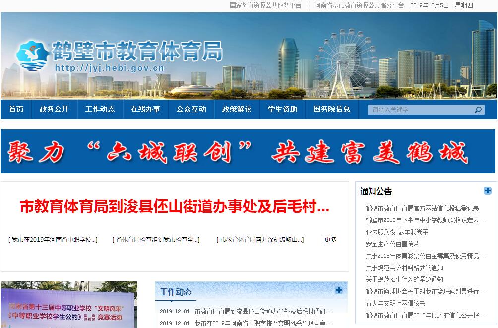 鹤壁市教育体育局贯彻落实党中央关于教育体育工作的方针政策和决策部署,在履行职责过程中坚持和加强党对教育体育工作的集中统一领导。其主要职责是:(一)贯彻落实党和国家的教育体育工作方针政策和有关法律法规;负责教育体育理论研究和宣传工作。(二)研究提出在全市教育体育系统坚持党的领导、加强党的建设政策措施并组织实施;统筹全市教育体育工作的总体布局并负责协调推进和督促落实。(三)负责全市各级各类教育体育事业的统筹规划和协调管理;拟订全市教育体育改革和教育体育事业发展规划;指导全市各级各类学校的教育教学改革,推进全市体育公共服务和体育体制改革;负责全市教育基本信息的统计、分析和发布。(四)负责本部门教育体育经费的统筹管理,参与拟订教育体育经费筹措、拨款和基建投资的政策;负责统计全市教育体育经费收支情况;指导教育体育系统内部审计工作。(五)负责推进全市义务教育均衡发展和促进教育公平;负责义务教育的宏观指导与协调;指导普通高中教育、学前教育和特殊教育工作;落实基础教育教学基本要求,全面实施素质教育;指导全市教育督导工作,组织对中等及中等以下教育督导检查和评估验收工作;负责基础教育发展水平、质量的监测工作。(六)指导以就业为导向的职业教育的发展与改革,落实中等职业教育专业目录、教学指导文件和教学评估标准。(七)统筹指导高等教育发展与改革,落实高等教育学科专业目录和教学指导文件。(八)主管全市教师工作。负责全市各级各类学校教师资格制度实施;会同有关部门做好学校编制管理工作;指导各级各类学校内部人事与分配制度改革;负责全市教育体育系统的表彰奖励,归口管理教师和教育管理人员继续教育;指导全市教育体育系统人才队伍建设。(九)负责全市教育体育系统思想政治、意识形态工作;指导全市教育体育系统落实好党的民族宗教政策;指导全市各级各类学校的德育、体育、卫生、艺术教育、劳动教育、国防教育工作;拟订德育、体育、卫生、艺术、劳动教育教学的指导性文件;负责教育体育系统安全稳定与信访工作。(十)拟订中等教育招生计划;参与拟订大中专毕业生就业政策,指导大中专院校开展毕业生就业创业工作;负责管理全市教育体育系统科研工作;指导全市教育体育系统信息化建设。(十一)落实国家语言文字工作的方针、政策,拟订全市语言文字工作规划;负责全市普通话推广工作和普通话师资培训工作。组织指导全市教育体育对外交流与合作。(十二)推行全民健身计划,指导开展群众性体育活动,推动建立和完善全民健身公共服务体系。(十三)统筹规划全市竞技体育发展和体育运动项目设置与重点布局,负责市运动队伍建设和体育后备人才的培养,组织管理国内外重大体育竞赛的备战及参赛工作。组织开展体育运动中的反兴奋剂工作。(十四)组织举办全市综合性体育运动会,统筹规划青少年体育发展,指导和推进青少年体育工作。(十五)拟订全市体育产业政策,推进全市体育产业发展。推动体育标准化建设;协助省体育部门做好体育彩票的发行管理工作。(十六)完成市委、市政府交办的其他任务。