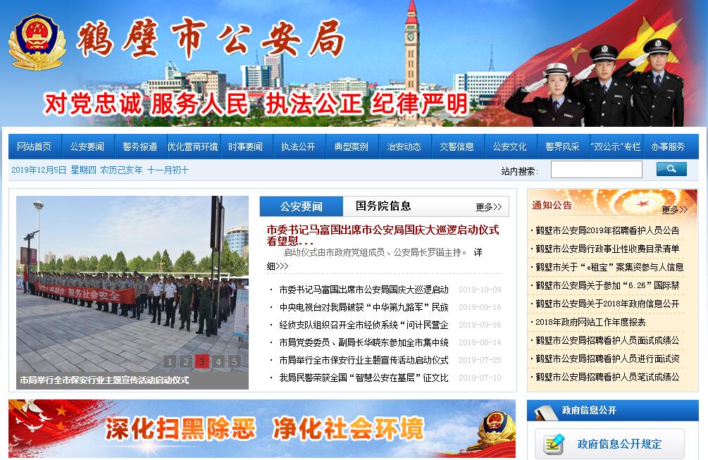 鹤壁市公安局是市政府主管全市公安工作的职能部门,其主要职责是:(一)贯彻落实党中央、国务院关于公安工作的方针、政策和法律、法规,制定全市公安工作的有关规定,部署、指导、监督、检查全市公安工作。(二)掌握影响稳定、危害全市安全和社会治安的情况,分析形势,制定对策。(三)组织指导全市公安机关侦查工作,协调、办理重大刑事案件、市内危害国家安全的犯罪案件、重大经济犯罪案件、上级批办的重大案件及专项工作。(四)负责全市治安管理工作。协调、处置重大治安事故和群体性事件;指导、监督全市公安机关依法查处危害社会治安秩序行为;依法管理危险物品和特种行业等工作;指导、监督县、区公安机关治安保卫工作。(五)依法开展管理国籍工作,指导全市出入境、持普通护照的外国人和香港、澳门特别行政区及台湾地区人员在本市居留、旅行的有关管理工作。(六)指导监督消防工作。(七)指导监督全市公安机关维护道路交通安全、道路交通秩序以及开展机动车辆、驾驶人管理工作;维护公路交通、治安秩序。(八)指导、监督全市公安机关对公共信息网络的安全监察工作。(九)防范、处置邪教组织的违法犯罪活动。(十)组织、指导、协调对恐怖活动的防范、侦查工作。(十一)指导、监督全市公安机关依法承担的执行刑罚工作,指导、监督全市公安机关对看守所、拘留所、强制隔离戒毒所管理工作。(十二)指导监督全市劳动教养审批工作及公安机关承办地方人民政府劳动教养委员会的日常工作。(十三)组织实施对党和国家领导人以及重要外宾在我市的安全警卫工作。(十四)组织开展全市公安科学技术工作,规划公安机关信息技术、刑事技术和技术侦查建设。(十五)拟定全市公安机关装备、被装配备、经费标准,拟定管理制度。组织协调全市公安机关重大任务的警务保障工作。(十六)统一领导全市公安消防部队建设,对武警支队执行公安任务及相关业务建设实施领导和指挥。(十七)拟定全市公安机关人员培训、教育规划。按规定组织实施教学培训工作。(十八)拟定全市公安队伍监督管理工作规定,组织、指导公安机关督察、审计、信访工作;按规定权限实施对干部的监督;协助各级纪检、监察部门查处或督办公安队伍重大违纪案件;指导全市公安队伍思想作风、工作作风建设。(十九)拟定全市公安机关思想政治工作规定;按规定权限管理干部人事工作;拟定全市公安机关宣传规划;组织、指导全市公安机关离退休人员管理工作。(二十)承办市委、市政府交办的其他事项。
