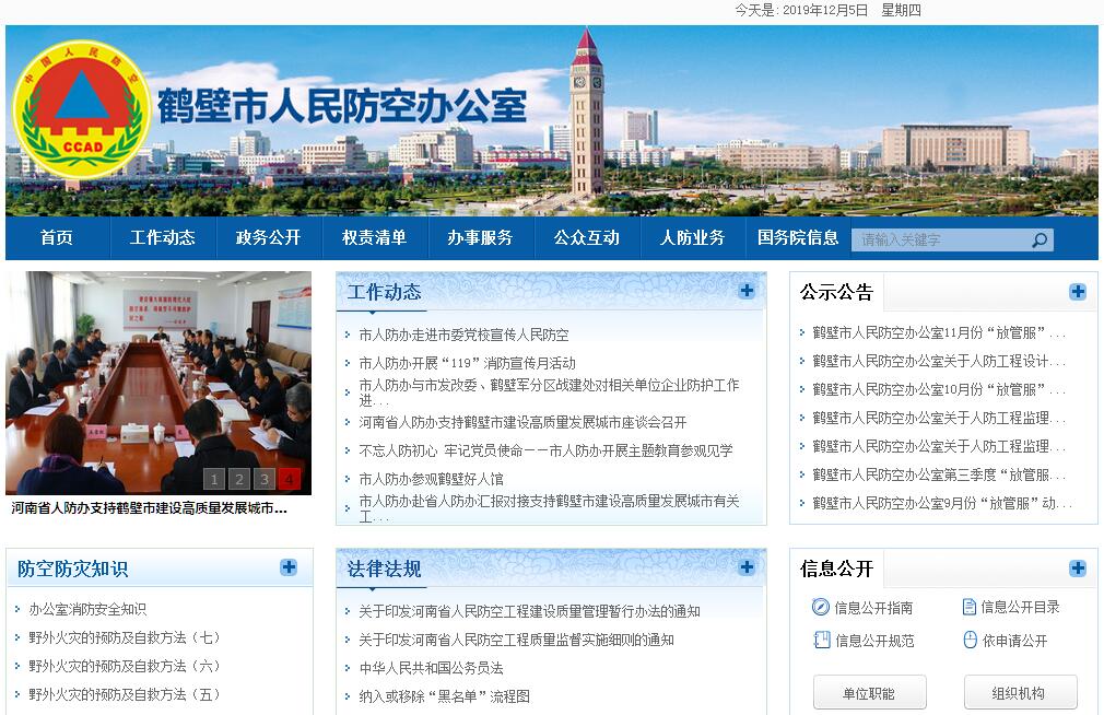 鹤壁市人民防空办公室主要职责:(一)贯彻执行国家人民防空法律、规章和方针政策,拟订全市人民防空规范性文件并监督实施。(二)负责拟订全市人民防空建设规划、城市平战综合防护建设发展规划及相关专项规划并组织实施,参与拟订重要经济目标防护建设总体规划、城市地下空间暨人民防空工程综合利用规划并协同实施。(三)监督管理全市人民防空设施建设、维护和使用。(四)监督指导城市地下空间兼顾人民防空需要防护部分的管理。(五)负责组织开展人民防空执法监管工作。(六)会同有关部门指导开展城市和重要经济目标单位防护工作。组织拟订修订城市人民防空袭方案,指导拟订重要经济目标防护方案,组织开展城市人民防空演训。(七)指导开展人民防空群众组织建设。(八)开展人民防空日常战备工作。(九)组织开展人民防空宣传教育工作。(十)组织开展人民防空科研工作,推进人民防空科技创新和科研成果转化应用推广。(十一)组织实施人民防空信息化体系能力建设。(十二)负责人民防空平战结合工作,利用人民防空战备资源参与抢险救灾、服务民生、改善民生,为应急救援提供支持。战时组织开展城市人民防空行动。(十三)推进人民防空建设与经济社会融合发展。(十四)落实人民防空队伍建设要求,对县人民防空办公室主任的任免提出意见。(十五)负责依法征缴人民防空工程易地建设费,会同有关部门制定人民防空建设市场投融资政策。(十六)完成市委、市政府及鹤壁军分区交办的其他任务。