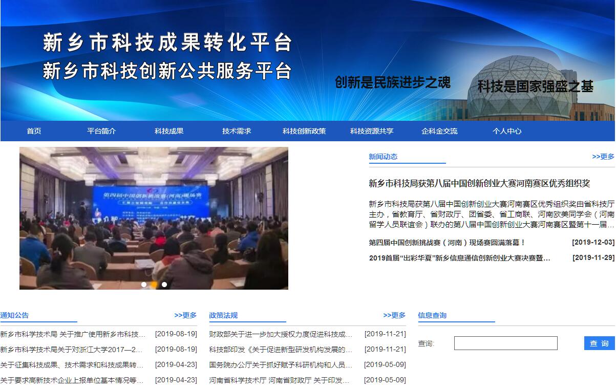 新乡市科技成果转化平台按照“整合、共享、服务、创新”的总体思路,围绕高校科研成果转化平台的建设目标和重点,凝聚高校、科研机构、企业等多方力量,从线上线下两个方面,整合科技创新政策、科研成果、企业技术需求、大型科研仪器等多种资源,积极探索成果转化的新途径、新机制,有效解决我市高校科研成果研发信息和企业技术需求信息的不对称、不畅通问题,更好促进科研成果转化政策法规的贯彻和实施,提升科技创新能力和科研成果转化应用水平,提高科研成果转化效率和成功率,服务我市产业结构的优化升级。“平台”主要定位于“汇聚成果,挖掘需求,集聚政策,展示企业形象,分析转化案例”等功能,下设科技成果、企业需求、政策法规、高企展示、特殊案例等功能模块,为企业特别是科技企业与政府机关、科研机构、高等院校、金融机构等之间架起桥梁,提高企业的科技创新能力和市场竞争能力,促进科技与经济的紧密结合。“平台”主要业务范围:(1)科技创新政策服务。通过对近年来国家、省、市出台的涉及科技成果转化、科技创新发展、科技金融、科技惠民和“双创”等政策进行整理、汇总,为新乡市有创新创业需求的企事业单位提供技术、管理、政策法规等各方面的信息和数据资料。(2)科技成果信息发布。通过各种渠道采集、筛选、分类科技成果信息,对成熟度高、适于转化、市场前景广阔、适应我市企业技术需求和产业发展要求的科研成果,包括驻新各高校、科研院所拥有的科研成果,以及市外高校和科研院所的重要科研成果,定期进行发布,为供需双方的交流和对接提供更多的优质信息资源,促进科技成果转化应用。(3)企业技术需求展示。通过征询和收集,及时将我市企业的技术需求,重点是科技型中小企业、高新技术企业的技术需求定期进行发布,为寻求解决企业技术难题寻求最佳方案,并提供帮助和服务。(4)科技资源共享。通过对驻新高校、科研院所、高新技术企业、新型研发机构、科技企业孵化器、星创天地等科技资源的展示,一是可以较全面了解驻新高校的师资力量、特色专业与学科、创新平台和教学科研成果等信息,了解科研院所的基本情况、科研团队、科研成果等情况,便于新乡市内外的企业与高校、科研院所开展产学研密切合作,促进科技成果的转化;二是通过对新乡市高新技术企业的基本情况、特色产品、科研平台建设情况、产学研合作情况、研发支出情况和科技成果取得转化情况等进行展示,为我市企事业单位和广大市民进一步了解高新技术企业的发展情况提供信息服务。三是可以为创新创业团队和个人提供科技企业孵化器和星创天地的基本信息,便于创新创业团队和个人选择更好的孵化平台,减少创新创业的风险和成本,提高创新创业的成功率。同时也为孵化平台的发展提供更多更好地选择对象和优秀资源,提供更为优质的服务,助推新乡市创新创业工作的开展。(5)企科金交流。主要用于高校、科研院所、企业和金融机构等单位,以及专家、教授、企业技术人员和管理人员在线上针对产学研工作展开交流,同时也可以开展其他问题的交流、咨询等。(6)成果转化案例分析。通过对高校、科研院所、企业优秀科技成果转化案例的展示,可以全面分析科技成果转移转化收益分配制度的制定和执行情况,科技成果激励政策的落实情况,以及科技成果所有权改革情况,为我市制定科技成果转化激励政策,深化科技成果体制机制改革提供服务。