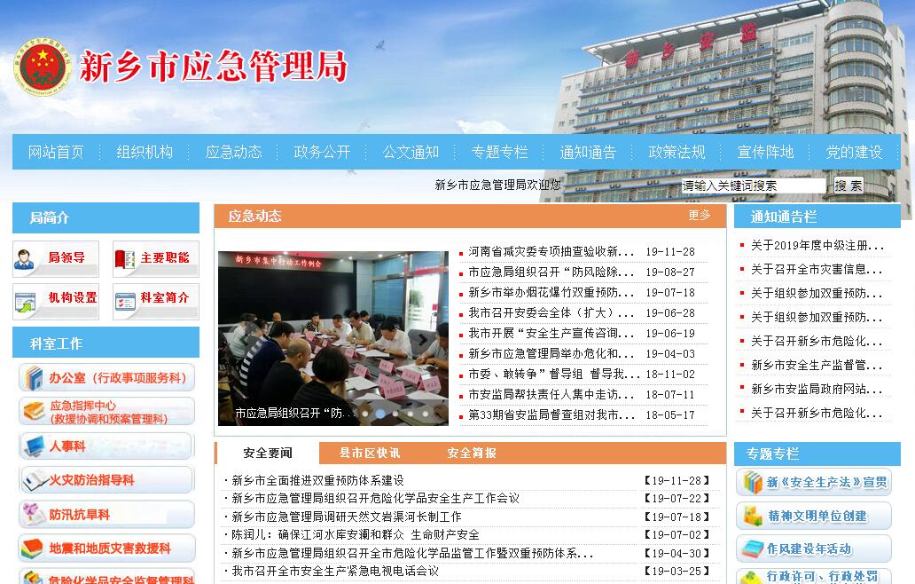 新乡市应急管理局主要职责:(一)负责全市应急管理工作,指导各级各部门应对安全生产类、自然灾害类等突发事件和综合防灾减灾救灾工作。负责全市安全生产综合监督管理和工矿商贸行业安全生产监督管理工作。(二)拟订全市应急管理、安全生产等政策规定,负责全市安全生产应急救援资源综合管理工作,组织编制市应急体系建设、安全生产和综合防灾减灾规划,组织制定相关规程和标准并监督实施。(三)指导全市应急预案体系建设,建立完善事故灾难和自然灾害分级应对制度,组织编制全市总体应急预案和安全生产类、自然灾害类专项预案,综合协调应急预案衔接工作,组织开展预案演练,推动应急避难设施建设。(四)牵头建立统一的全市应急管理信息系统,负责信息传输和共享,建立监测预警和灾情报告制度,健全自然灾害信息资源获取和共享机制,依法统一发布灾情。(五)组织指导协调安全生产类、自然灾害类等突发事件应急救援,承担市应对较大灾害指挥机构工作,综合研判突发事件发展态势并提出应对建议,协助市委、市政府指定的负责同志组织较大灾害应急处置工作。(六)统一协调指挥各类应急专业队伍,建立应急协调联动机制,推进指挥平台对接,衔接驻新解放军和武警部队参与应急救援工作。(七)统筹应急救援力量建设,负责森林和草原火灾扑救、抗洪抢险、地震和地质灾害救援、生产安全事故救援(含煤矿)等专业应急救援力量建设,指导市综合性应急救援队伍建设,指导县(市、区)及社会应急救援力量建设。(八)组织指导消防工作,指导消防监督、火灾预防、火灾扑救等工作。(九)指导协调全市森林和草原火灾、水旱灾害、地震和地质灾害等防治工作;依法监督管理全市防震减灾工作,指导协调地震灾害综合防御等工作;负责自然灾害综合监测预警工作,指导开展自然灾害综合风险评估工作。(十)组织协调全市灾害救助工作,组织指导灾情核查、损失评估、救灾捐赠工作,按权限管理、分配救灾款物并监督使用。(十一)依法行使安全生产综合监督管理职权,指导协调、监督检查市政府有关部门和各县(市、区)政府安全生产工作,督促、指导安全生产责任落实。组织开展安全生产巡查、考核工作。承担新乡市安全生产委员会日常工作。(十二)按照分级、属地原则,依法监督检查工矿商贸生产经营单位贯彻执行安全生产法律法规情况,及其安全生产条件和有关设备(特种设备除外)、材料、劳动防护用品的安全生产管理工作。依法组织实施安全生产准入制度,并对执行情况进行指导和监督。负责危险化学品安全监督管理综合工作和烟花爆竹经营企业安全生产监督管理工作。(十三)依法组织指导生产安全事故调查处理,监督事故查处和责任追究落实情况。组织开展自然灾害类突发事件的调查评估工作。协助国家、省调查处理重大以上事故。综合管理全市生产安全伤亡事故、事故隐患排查治理、安全生产统计分析工作。(十四)制定应急物资储备和应急救援装备规划并组织实施,会同市粮食和物资储备局等部门建立健全应急物资信息平台和调拨制度,在救灾时统一调度。(十五)负责应急管理、安全生产宣传教育和培训工作,组织指导应急管理、安全生产的科学技术推广应用和信息化建设工作。依法组织、指导并监督特种作业(不含煤矿安全作业)人员操作资格考核工作和工矿商贸生产经营单位(不含煤矿企业)主要负责人、安全生产管理人员安全生产知识和管理能力考核工作,监督检查工矿商贸生产经营单位安全培训工作。配合做好注册安全工程师执业资格考试相关工作。(十六)负责监督指导和组织协调全市安全生产行政执法工作。(十七)开展应急管理方面的交流与合作,组织参与安全生产类、自然灾害类等突发事件的跨区域救援工作。(十八)完成市委、市政府交办的其他任务。