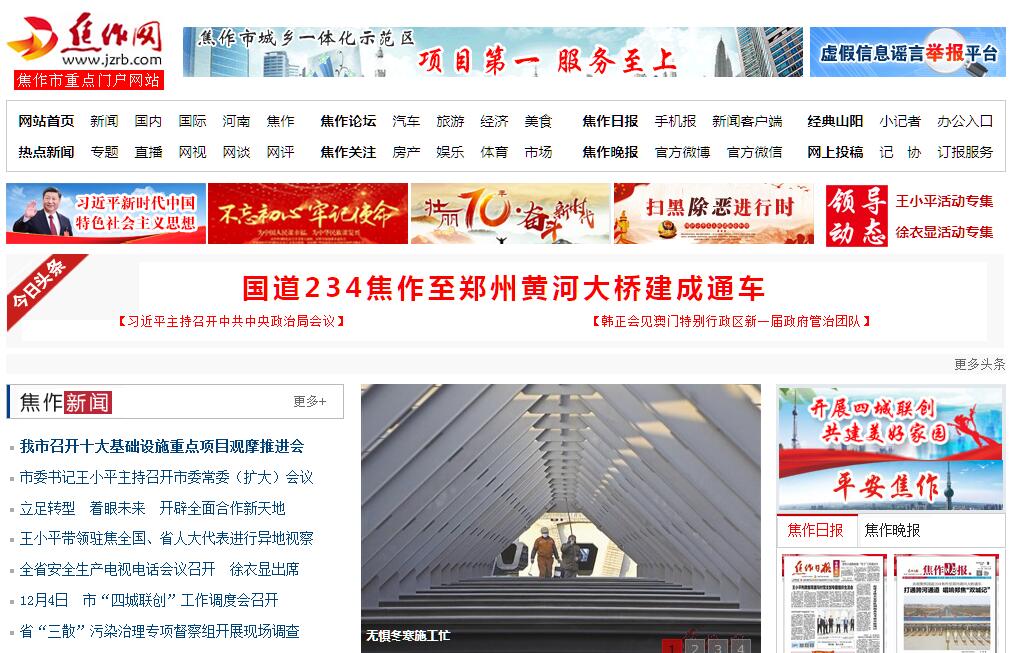 焦作网前身是焦作日报电子版、焦作新闻网。焦作网建于1998 年11 月,由焦作市委宣传部主管、焦作日报社主办。是焦作市惟一一家集国际国内要闻、当地新闻、政府信息服务、数字报纸、视频新闻、网络直播、财经、旅游、时尚、健康等多频道为一体的综合性新闻网站。焦作网建立以来,认真贯彻“高举旗帜,围绕大局,服务人民,改革创新”方针,始终把握正确的舆论导向,坚持贴近实际,贴近群众,贴近生活的原则,使焦作网成为焦作市最具影响力的重点门户网站,成为焦作市的网上新闻发布中心,成为焦作市的网上信息服务中心,成为焦作市对外宣传的重要窗口。焦作网做为焦作日报、焦作日报晚报版的网际延伸,立足于本地化、区域化,依托市委机关报强大的媒体资源优势和已有的网络优势,紧紧围绕市委、市政府的中心工作大局,密切关注百姓民生民情,坚持为人民服务,为焦作经济建设服务,借助网络,更加客观、详细、全面、即时、权威地报道本地新闻、提供各类服务信息,形成了与党报优势互补,功能互补,覆盖广泛的舆论引导新格局。焦作网每天对400余条新闻信息、30余个栏目和版块进行更新添加,焦作网每天的浏览量已达30000余人次。如今,登陆焦作网阅读焦作日报数字报纸,观看焦作新闻、视频新闻和网络直播,查找最新的信息资讯,参与网络各种互动,已经成为焦作市民的首选。焦作网的《焦作新闻》、《数字报纸》、《网络直播》、《新闻专题》、《视频新闻》等栏目,在宣传党的方针政策,密切党群关系,发布独家重大报道,正确引导舆论方面,发挥着越来越重要的作用,已经成为焦作网的品牌栏目,越来越受市委、市政府重视和焦作网民的关注。焦作网在坚持把社会效益放在首位的同时,还有效利用网络资源,充分发挥网络直播、视频新闻等品牌栏目的社会效应来创造经济效益。焦作网的日点击率、浏览量,政治影响力和社会影响力,吸引了诸多商家抢占网络广告这块阵地。焦作网取得了社会效益和经济效益双丰收,为网站继续健康有序创新发展奠定了坚实的基础。焦作网明确的定位,鲜明的特色,美观的页面,丰富的内容,良好的视觉,健康的格调,广泛的影响,也受到了河南省各兄弟报社网络同行的强烈关注及赞誉。