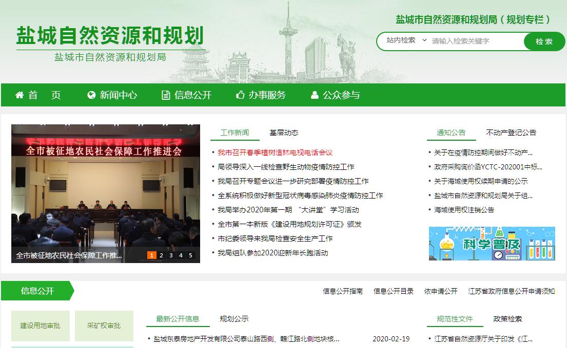 盐城市自然资源和规划局主要职责: (一)贯彻执行国家和省有关自然资源管理、国土空间规划及海洋、林业、测绘管理等法律法规。履行全民所有土地、矿产、森林、湿地、水、海洋等自然资源资产所有者职责和国土空间用途管制职责。(二)负责自然资源调查监测评价。贯彻执行自然资源调查监测评价的指标体系和统计标准,建立统一规范的自然资源调查监测评价制度。实施自然资源基础调查、专项调查和监测。负责自然资源调查监测评价成果的监督管理和信息发布。指导县(市、区)自然资源调查监测评价工作。(三)负责自然资源统一确权登记工作。组织实施各类自然资源和不动产统一确权登记、权籍调查、不动产测绘、争议调处、成果应用的制度、标准、规范。建立健全自然资源和不动产登记信息管理基础平台。负责自然资源和不动产登记资料收集、整理、共享、汇交管理等。指导监督县(市、区)自然资源和不动产确权登记工作。(四)负责自然资源资产有偿使用工作。贯彻执行全民所有自然资源资产统计制度,负责全民所有自然资源资产核算。编制全民所有自然资源资产负债表,执行考核标准。贯彻执行全民所有自然资源资产划拨、出让、租赁、作价出资和土地储备政策,合理配置全民所有自然资源资产。负责自然资源资产价值评估管理,依法收缴相关资产收益。(五)负责自然资源的合理开发利用。贯彻执行自然资源发展规划和战略,执行自然资源开发利用标准,建立政府公示自然资源价格体系,组织开展自然资源分等定级价格评估,开展自然资源利用评价考核,指导节约集约利用。负责自然资源市场监管。组织研究自然资源管理涉及宏观调控、区域协调和城乡统筹的政策措施。(六)负责建立空间规划体系并监督实施。推进落实主体功能区战略和制度,组织编制并监督实施国土空间规划和相关专项规划。参与编制经济和社会发展规划。贯彻落实国土空间用途管制制度和城乡规划政策。组织划定生态保护红线、永久基本农田、城镇开发边界等控制线,构建节约资源和保护环境的生产、生活、生态空间布局。开展国土空间开发适宜性评价,建立国土空间规划实施监测、评估和预警体系。拟订并实施土地、海洋等自然资源年度利用计划。负责土地、海域、海岛等国土空间用途转用工作。负责土地征收征用管理。指导县(市)国土空间规划的编制、实施工作。(七)组织编制市域城镇体系规划、城市总体规划、村庄布局规划、详细规划、相关专项规划及重要地段的城市设计。负责开展城市发展战略和城乡规划研究工作。负责城市规划区规划管理和指导市域村镇规划工作。指导、审核、报批县(市)城乡规划工作。负责风景名胜区的规划管理工作。负责城乡规划设计单位的资质管理和行业管理工作。(八)负责市区建设项目规划许可的技术审查。负责城市规划区内的土地征收、国有土地使用权出让、转让的规划管理工作。参与城市规划区域内重大项目的可行性研究及规划论证工作。负责城市地下空间开发利用和地下管线的规划管理工作。(九)负责统筹国土空间生态修复。牵头编制国土空间生态修复规划,实施生态修复重要工程。负责统筹国土空间综合整治、土地整理复垦、地质环境恢复治理、海洋生态、海域海岸线和海岛修复、林地、湿地生态保护修复等工作。牵头实施生态保护补偿制度,拟订合理利用社会资金进行生态修复的政策措施,提出重要备选项目。(十)组织实施最严格的耕地保护制度。牵头拟订并组织实施耕地保护政策,负责耕地数量、质量、生态保护。组织实施耕地保护责任目标考核和永久基本农田特殊保护。落实耕地占补平衡制度,监督占用耕地补偿制度执行情况。(十一)负责地质矿产管理工作。组织实施地质调查和矿产资源勘查,管理市级地质勘查项目。负责地质灾害预防和治理,指导开展群测群防、专业监测和预报预警等工作。承担地质灾害应急救援的技术支撑工作。负责矿产资源储量管理及压覆矿产资源管理。负责矿业权管理。会同有关部门承担保护性开采的特定矿种、优势矿产的调控及相关管理工作。监督指导矿产资源合理利用和保护。负责古生物化石的监督管理。(十二)负责组织实施海洋规划和发展海洋经济。贯彻执行海洋发展战略,会同有关部门拟订海洋经济发展、海岸带综合保护利用等规划和政策并监督实施。统筹协调沿海滩涂围垦开发管理工作。负责海洋经济运行监测评估工作。(十三)负责海洋开发利用和保护的监督管理工作。负责海域使用和海岛保护利用管理。制定海域、海岛保护利用规划并监督实施。负责海洋观测预报、预警监测和减灾工作。参与重大海洋灾害应急处置。(十四)负责测绘地理信息管理工作。负责基础测绘和测绘行业管理。负责测绘资质资格与信用管理,监督管理地理信息安全和市场秩序。负责地理信息公共服务管理。负责测量标志保护。(十五)负责林业监督管理工作。负责拟订相关林业产业地方标准并监督实施。负责林业改革相关工作。分类指导公益林和商品林的培育。组织开展全民义务植树、城乡绿化工作。指导林业产业的发展,组织林产品质量监督。指导林业有害生物防治、检疫工作。指导国有林场基本建设和发展。承担林业应对气候变化的相关工作。(十